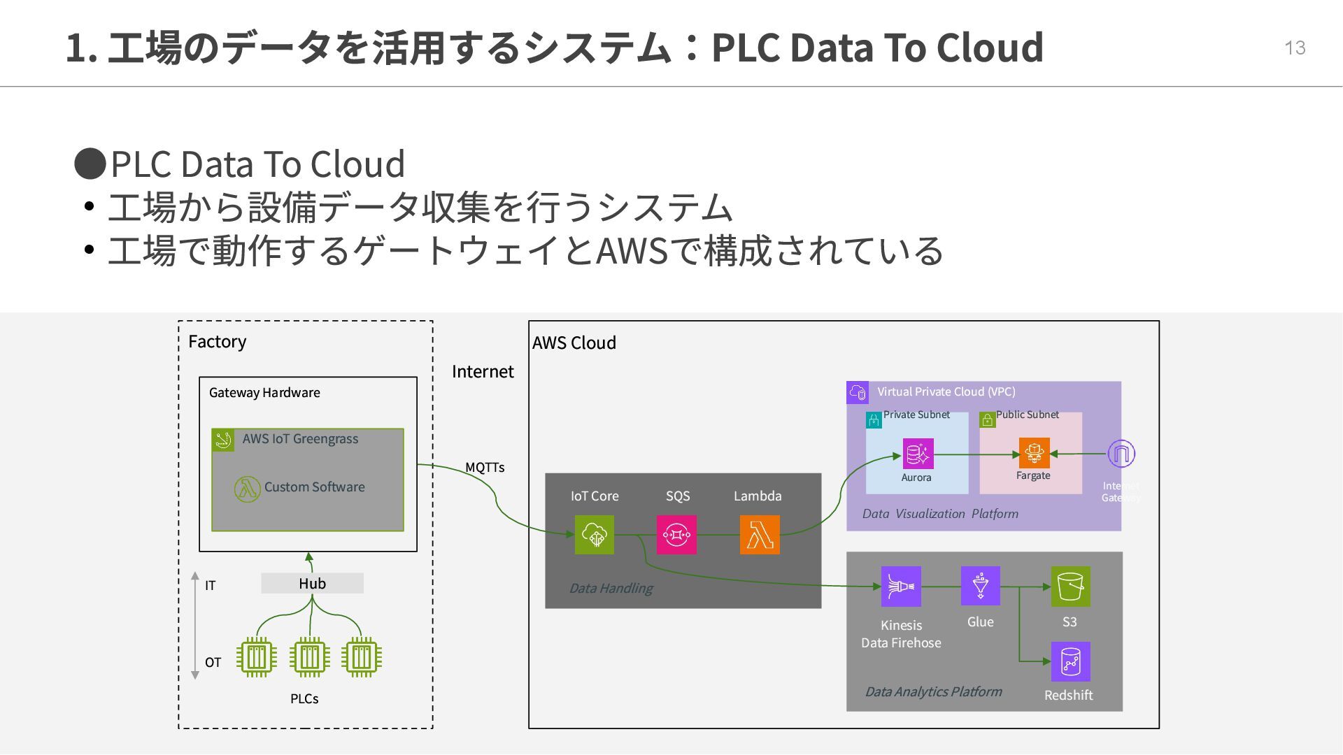  工場から設備データ 収集を行 うシステム  工場で動 作するゲートウェイとA WSで構 成されている Fa ctor y A WS IoT Green gra ss PLC s Gate wa y Hard ware Hu b Internet A WS Cloud IT OT MQTT s Data Visualization Platform Data Anal yt ics Plat for m Kine sis Data Fireho se S 3 Pr ivate Su bnet Pu bl ic Su bnet V irtual Pr ivate Cloud (VPC ) Internet Gate wa y Aurora Far gate Data Handl in g Glue Red sh ift IoT Core S QS La mbda Cu sto m So ft ware