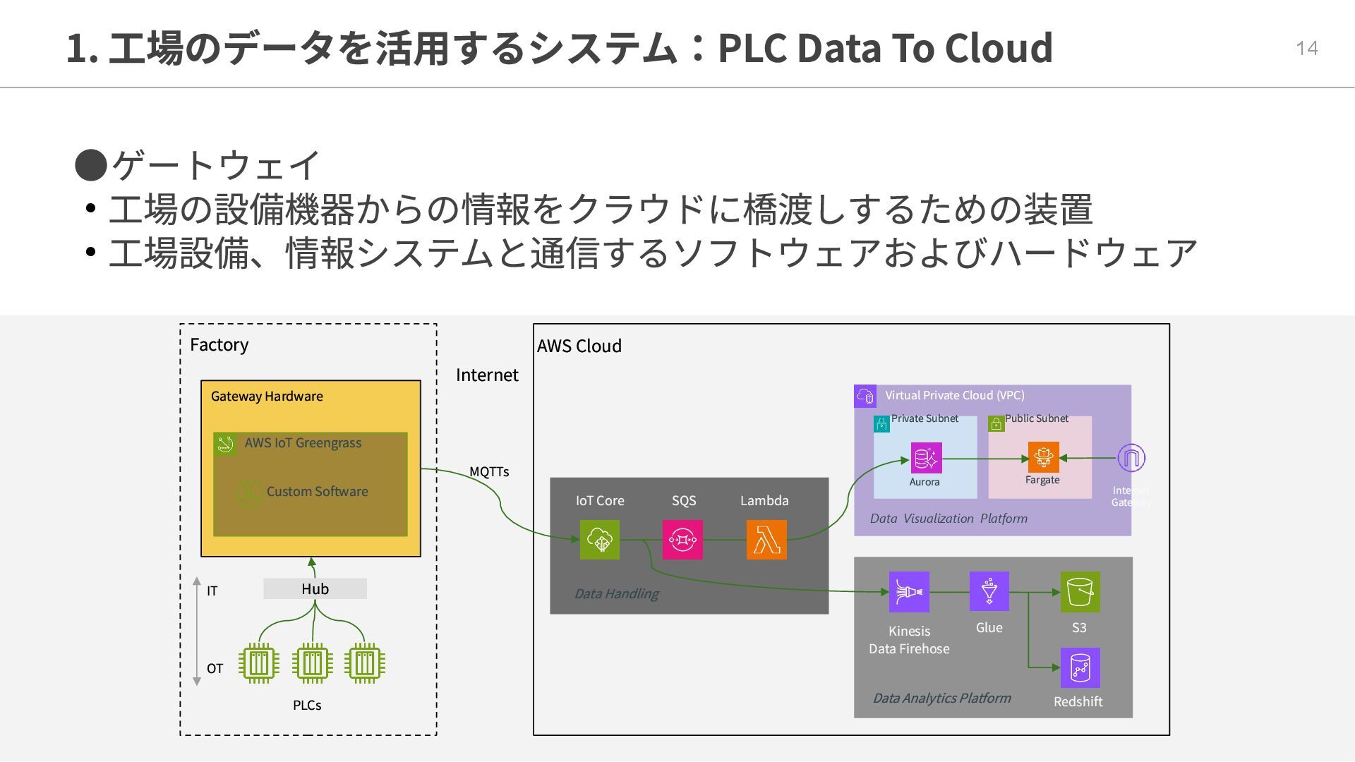 めの 装置  工場設備、情報システムと通信するソフトウェア およ びハードウェア Fa ctor y A WS IoT Green gra ss PLC s Gate wa y Hard ware Hu b Internet A WS Cloud IT OT MQTT s Data Visualization Platform Data Anal yt ics Plat for m Kine sis Data Fireho se S 3 Pr ivate Su bnet Pu bl ic Su bnet V irtual Pr ivate Cloud (VPC ) Internet Gate wa y Aurora Far gate Data Handl in g Glue Red sh ift IoT Core S QS La mbda Cu sto m So ft ware