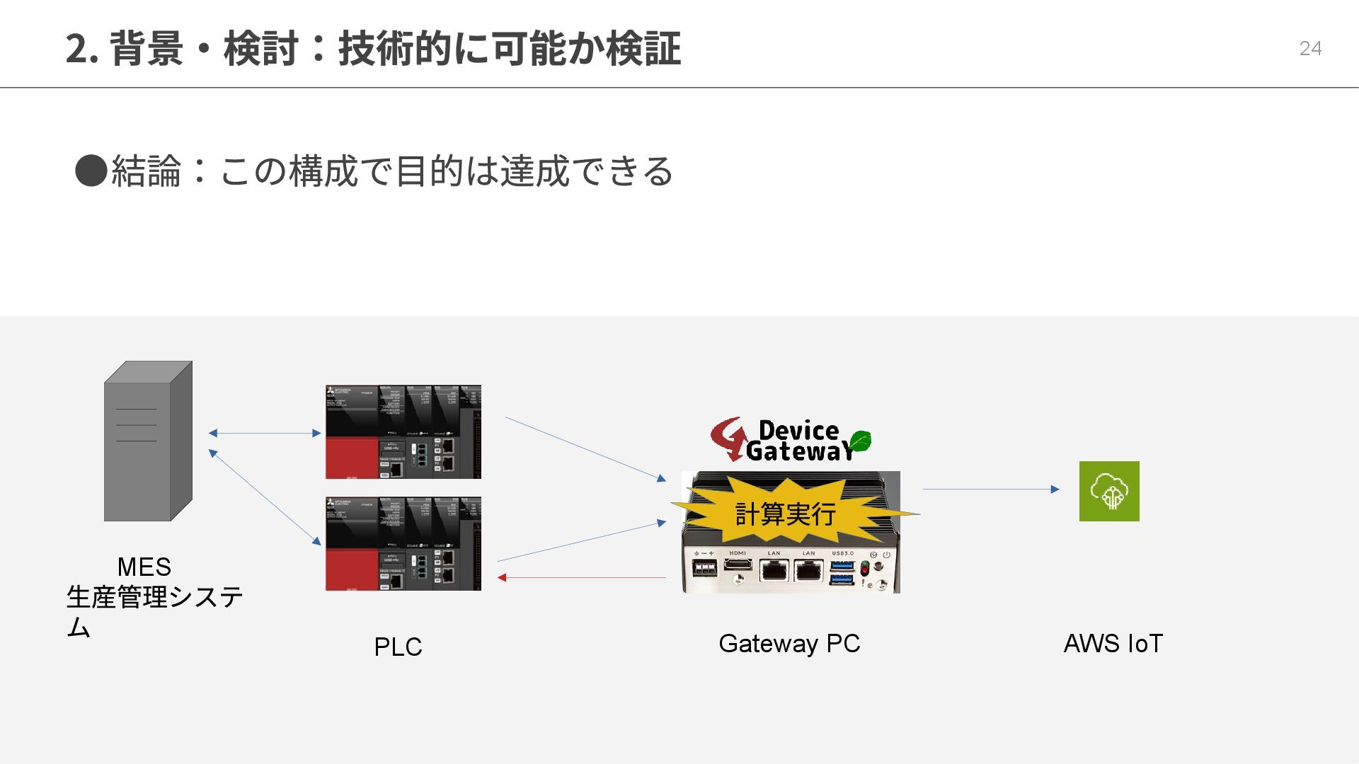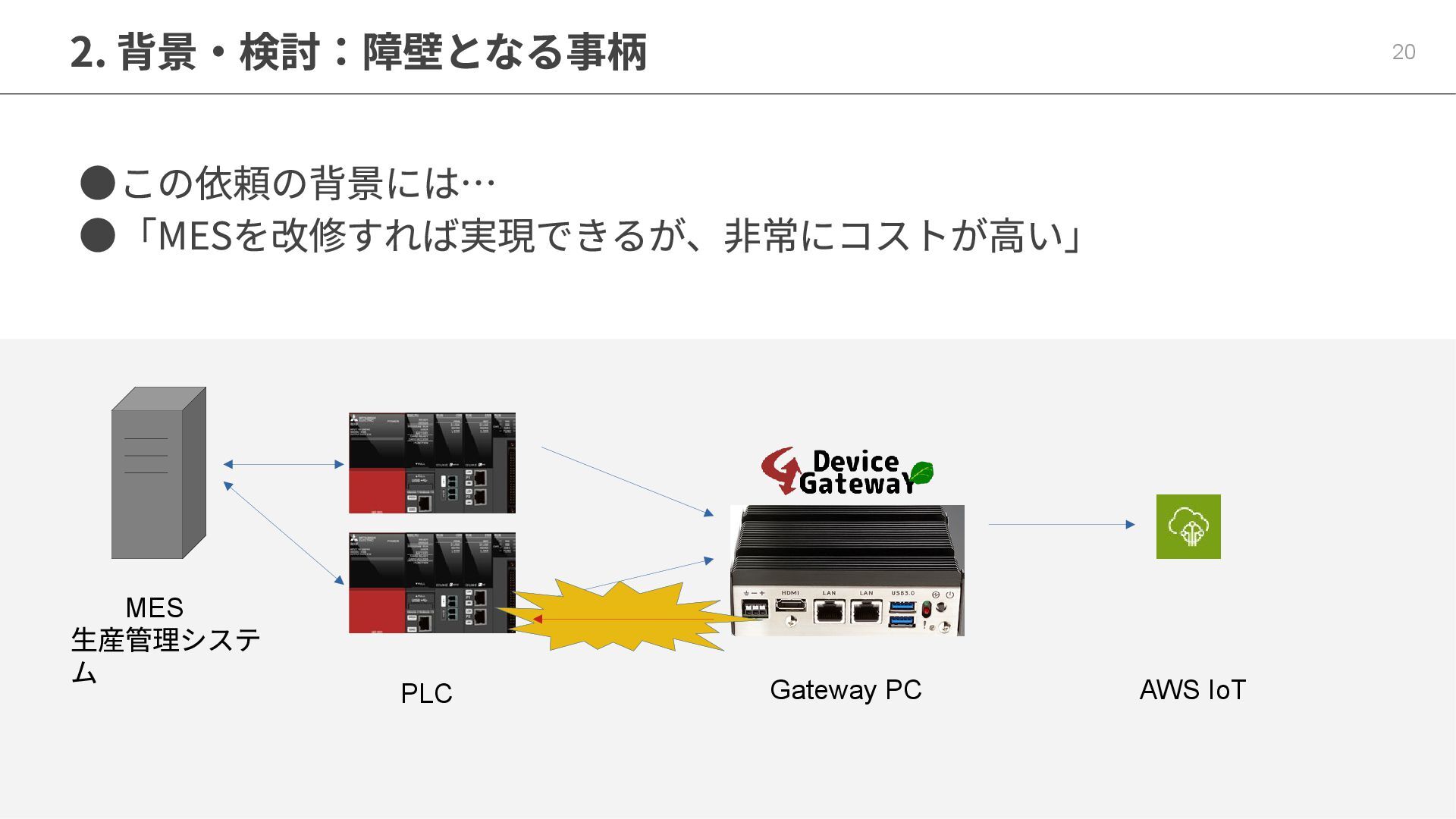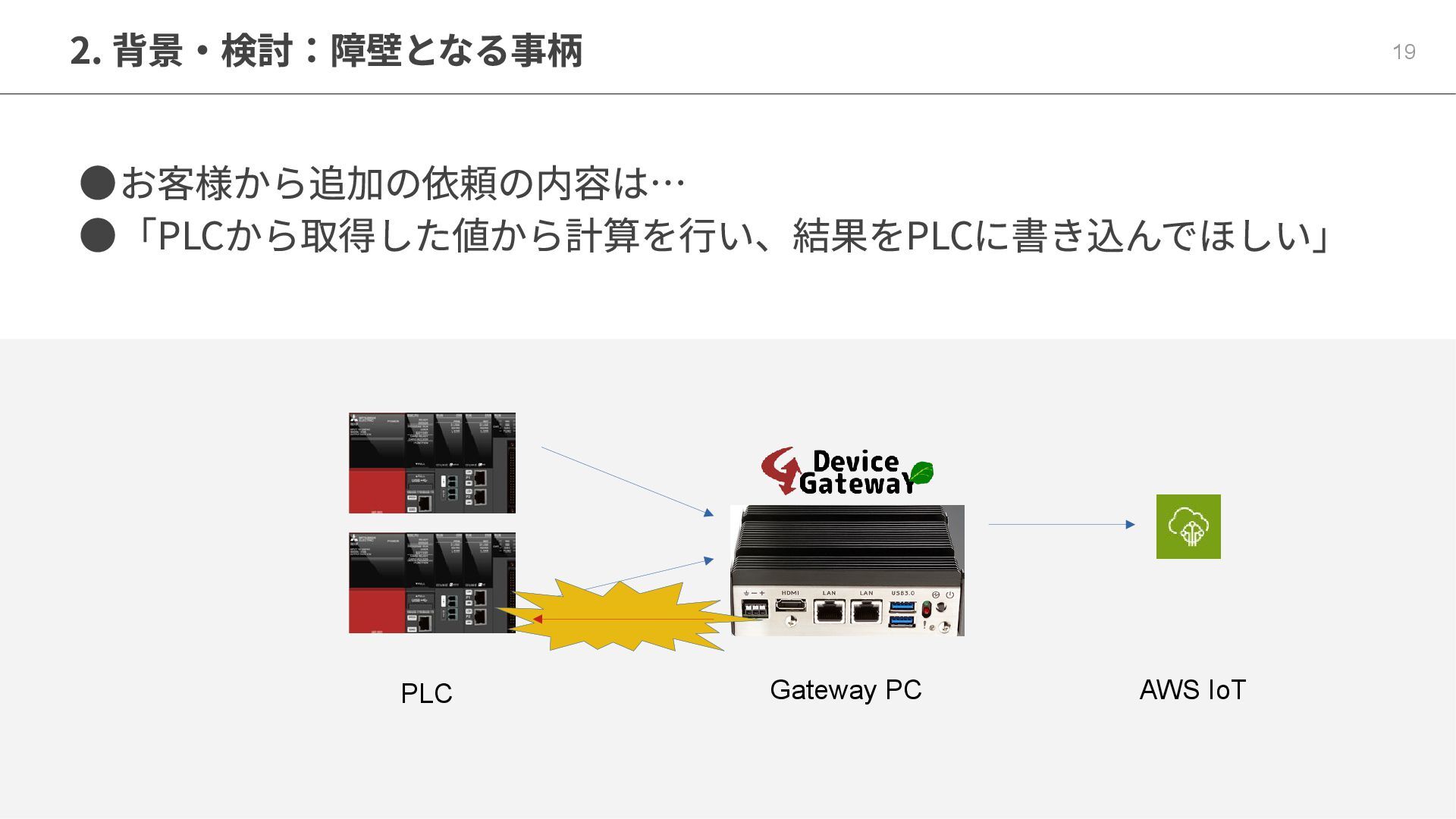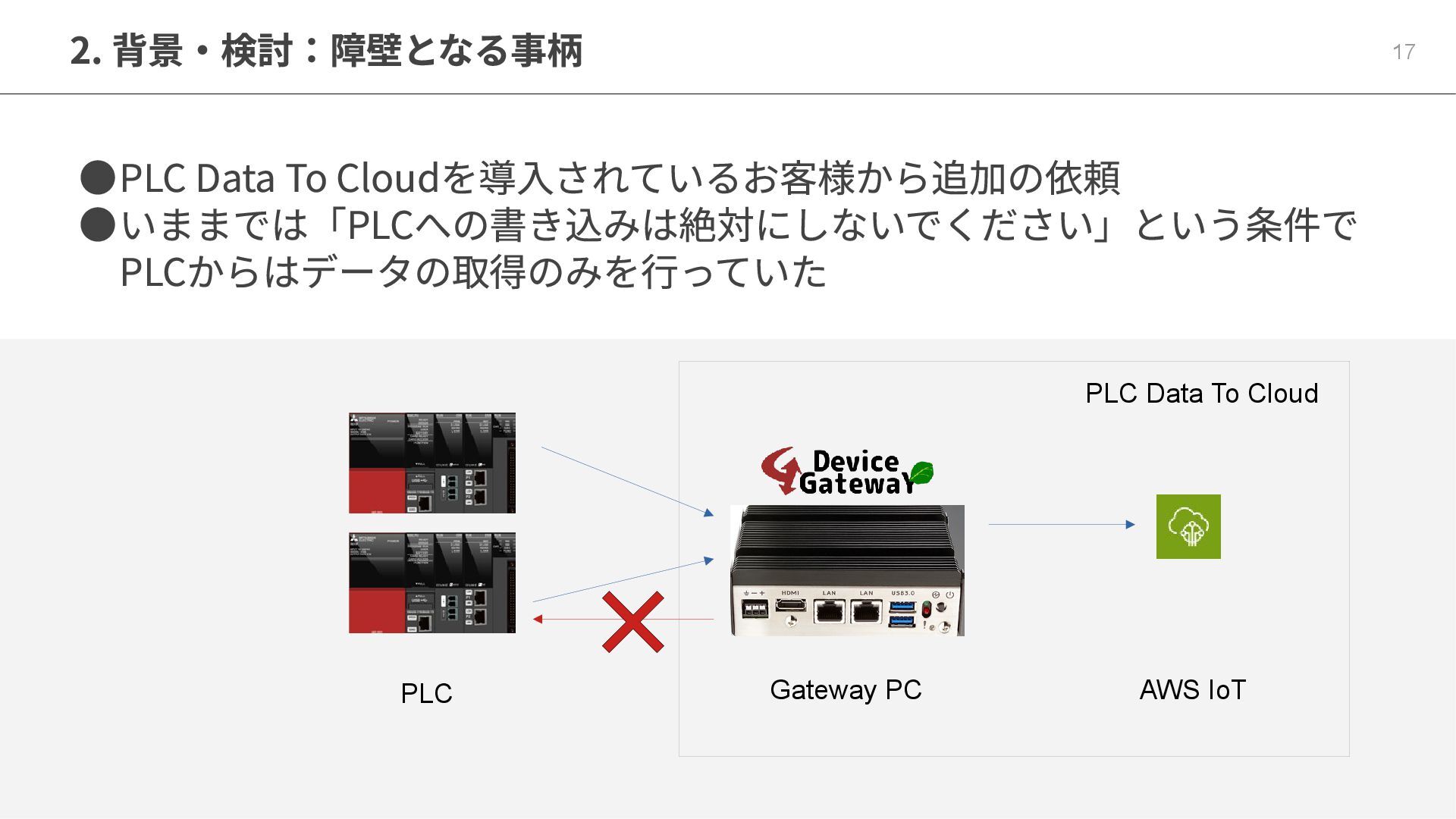 依頼 •いままでは 「PLCへの書き込みは 絶対にしないでく ださい 」とい う条件で PLCからはデータの 取得のみを行っていた PLC Gateway PC AWS IoT PLC Data To Cloud
