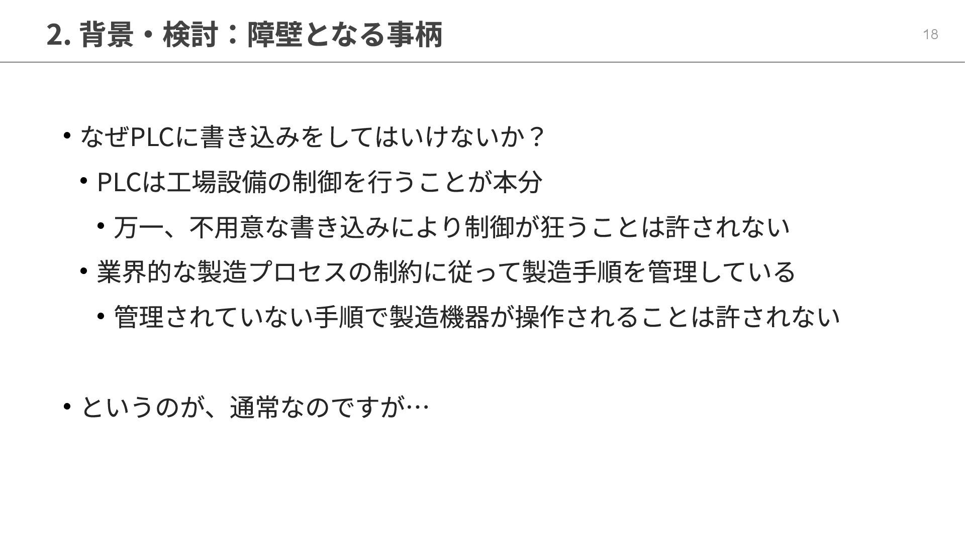 14. 2. 背景・検討:障壁となる事柄 18  な ぜPLCに書き込みをしてはいけないか ?  PLCは工場設備の制御を行 うことが本