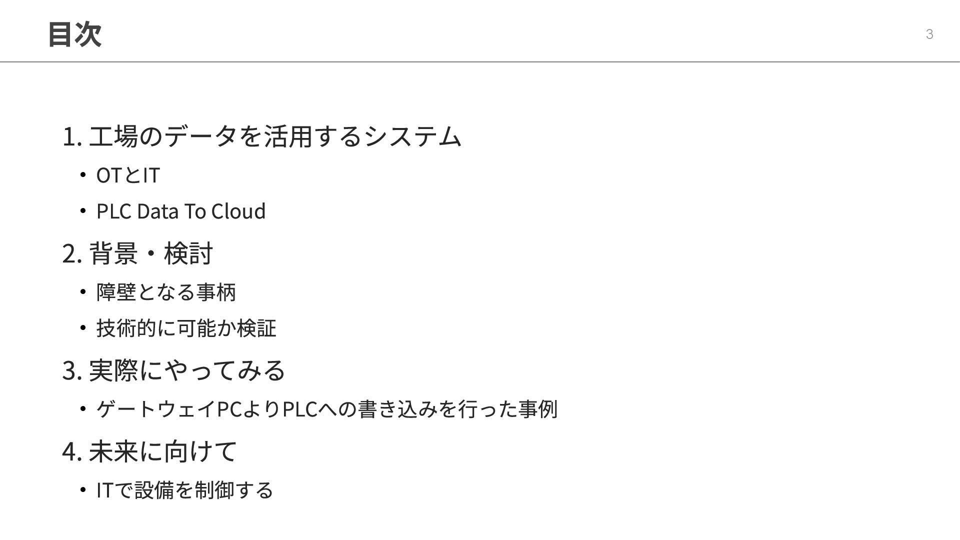 1. 目次 3 1. 工場のデータを活用するシステム  OTとIT  PLC Data To