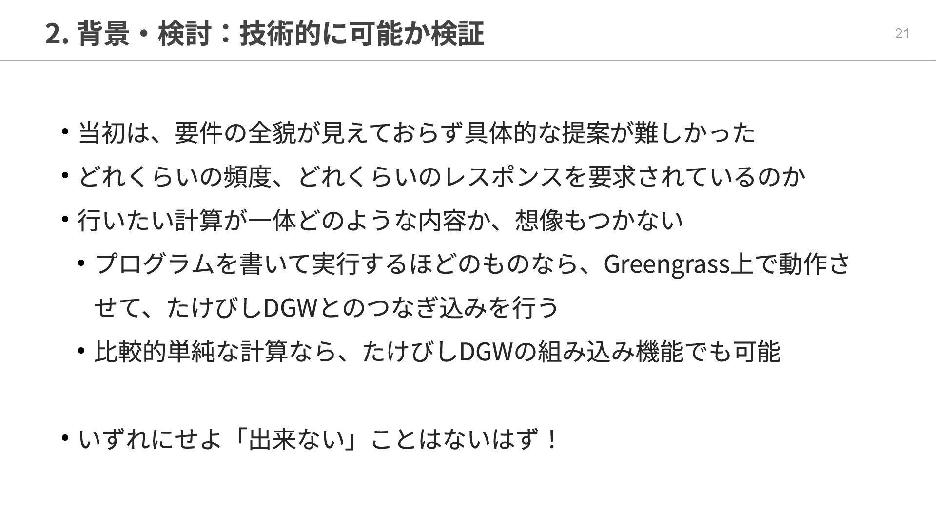 難しかった  どれくらいの 頻度、どれくらいのレス ポンスを要 求されているのか  行いたい 計算が一 体どのよ うな内容か、 想像もつかない  プロ グラムを書いて実行する ほどのものなら、 Green gra ss上で動 作さ せて、たけ びしD GWとのつな ぎ込みを行 う  比較的 単純な 計算なら、たけ びしD GWの 組み込み機能でも可能  い ずれに せよ 「出来ない 」ことはないは ず!