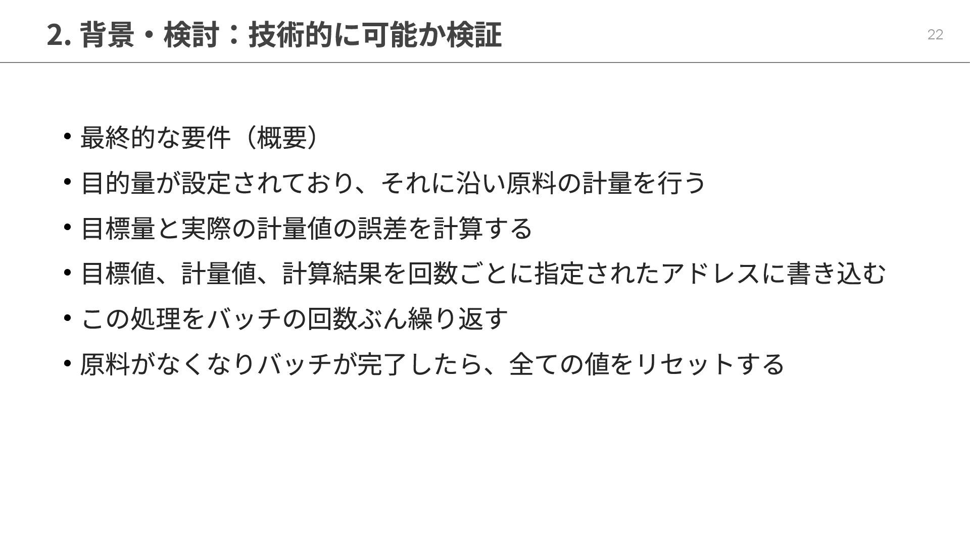 16. 2. 背景・検討:技術的に可能か検証 22  最終的な要件( 概要)  目的 量が設定されて おり、