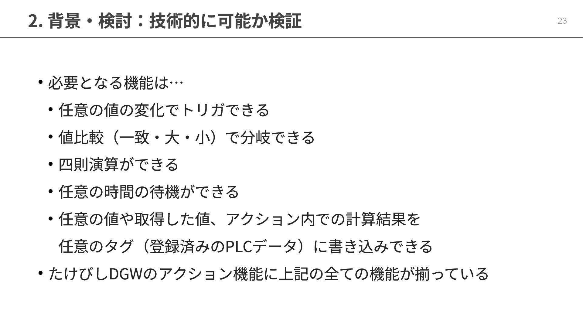  値比較(一 致・ 大・ 小)で 分岐できる  四則演算ができる  任意の時 間の 待機ができる  任意の 値や 取得した 値、アクシ ョン内での 計算結果を 任意のタ グ( 登録済みのPLCデータ)に書き込みできる  たけ びしD GWのアクシ ョン機能に上 記の全ての機能が 揃っている