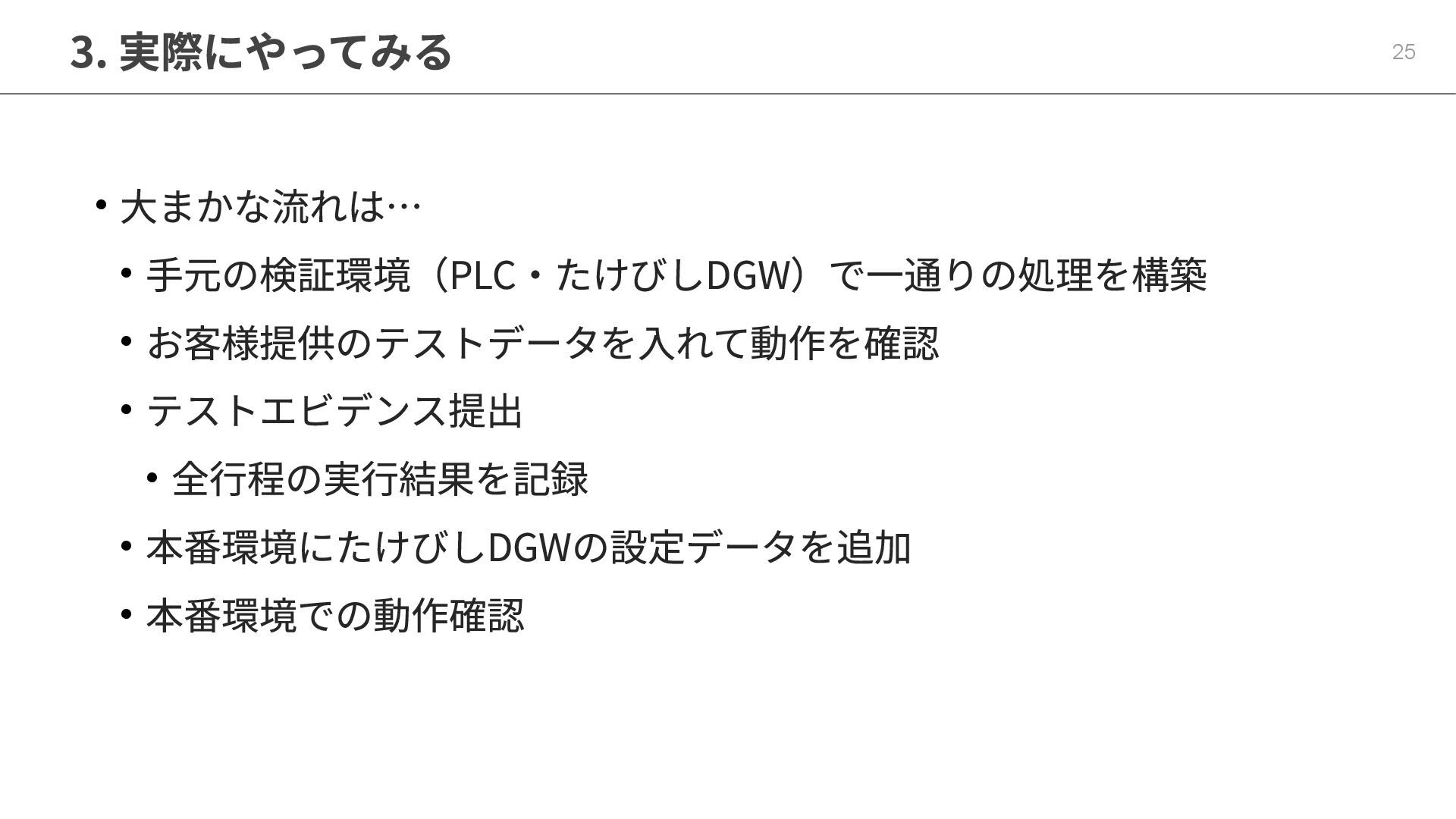 びしD GW)で一通りの 処理を構築  お客様提供のテストデータを 入れて動 作を 確認  テスト エビデンス 提出  全行程の実行 結果を 記録  本 番環境にたけ びしD GWの設定データを 追加  本 番環境での動 作確認