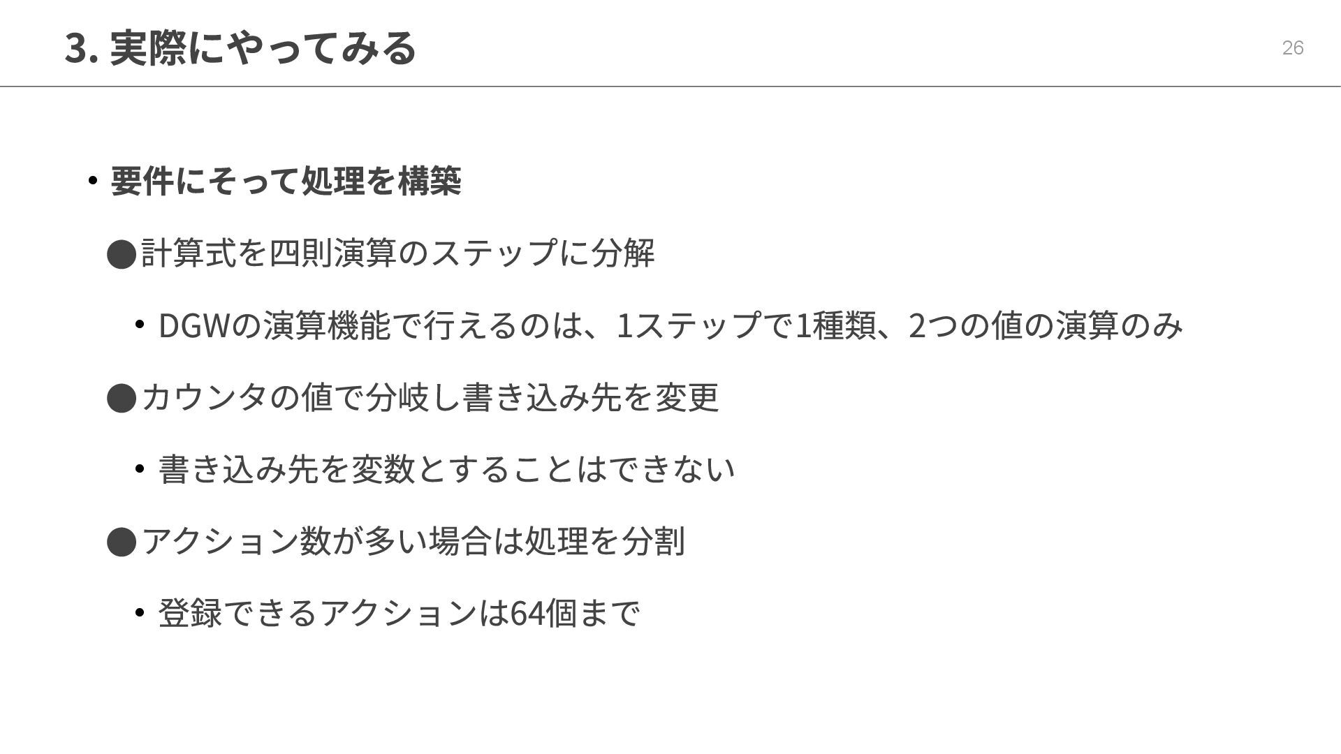 GWの 演算機能で行 えるのは、1ステップで1種 類、2つの 値の 演算のみ •カウンタの 値で 分岐し書き込み先を 変更  書き込み先を 変数とすることはできない •アクシ ョン 数が多い場合は 処理を 分割  登録できるアクシ ョンは 64 個まで