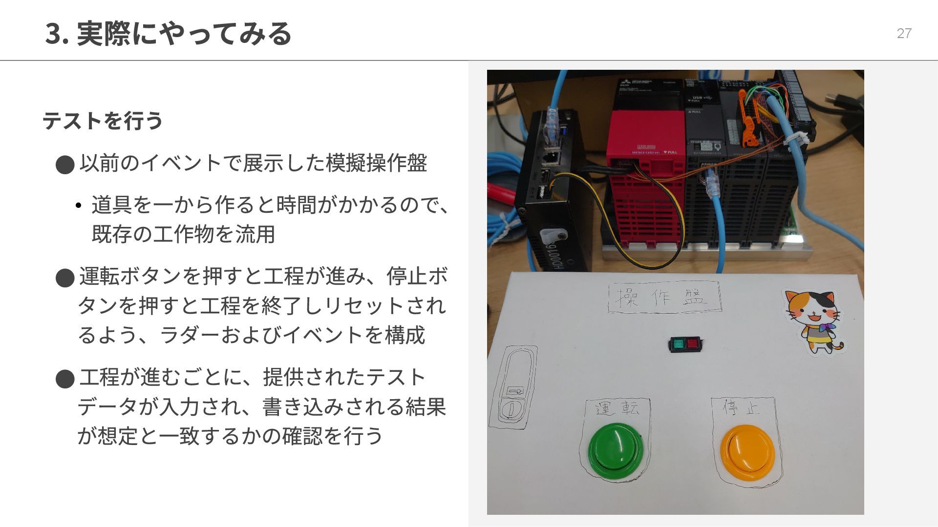  道具を一から 作ると時 間がかかるので、 既存の工 作物を 流用 •運転ボタンを 押すと工程が 進み、 停止ボ タンを 押すと工程を 終了しリセットされ るよ う、ラ ダー およ びイ ベントを構 成 •工程が 進むごとに、 提供されたテスト データが 入力され、書き込みされる 結果 が 想定と一 致するかの 確認を行 う