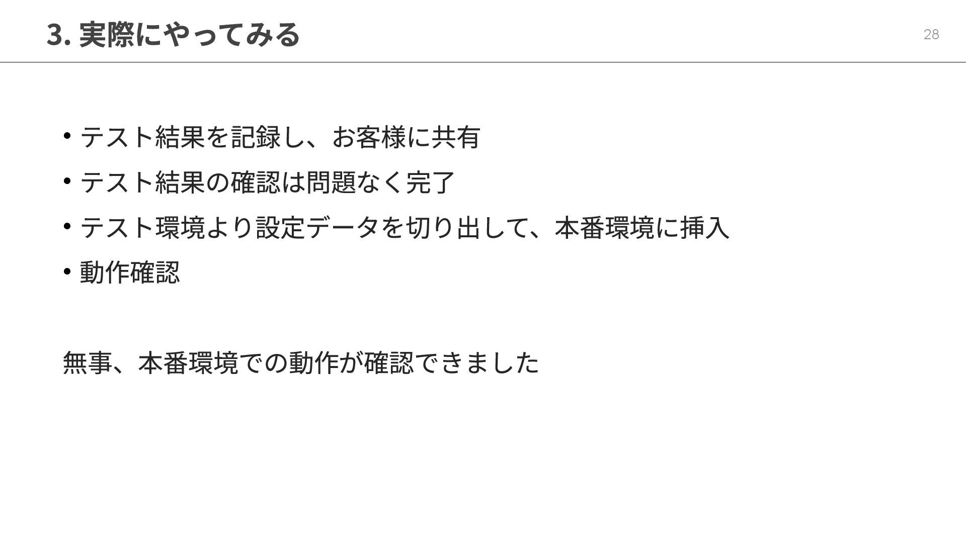 テスト 結果の 確認は 問題なく完 了  テスト 環境より設定データを 切り 出して、本 番環境に 挿入  動 作確認 無事、本 番環境での動 作が 確認できました