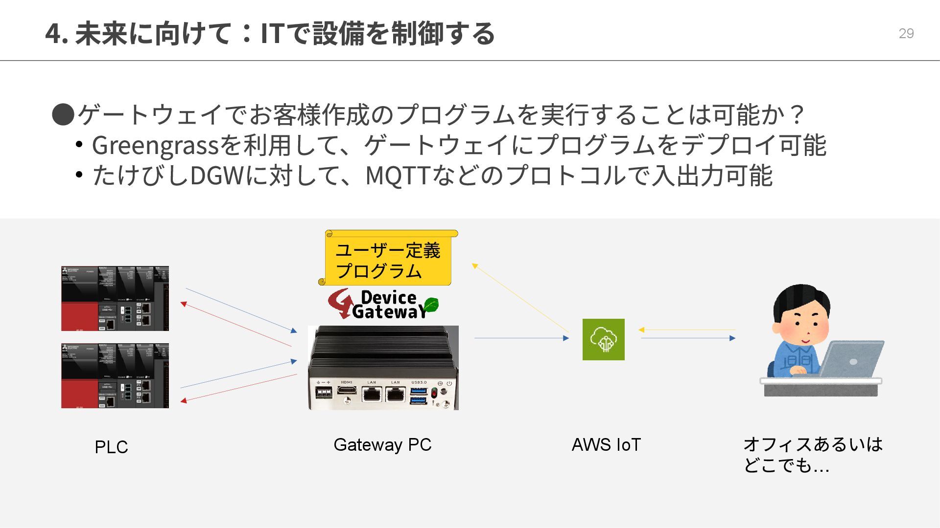 ssを利用して、ゲートウェイにプロ グラムをデプロイ可能  たけ びしD GWに対して、 MQTTなどのプロトコルで 入出力可能 PLC Gateway PC AWS IoT オフィスあるいは … どこでも ユー ザー定 義 プロ グラム