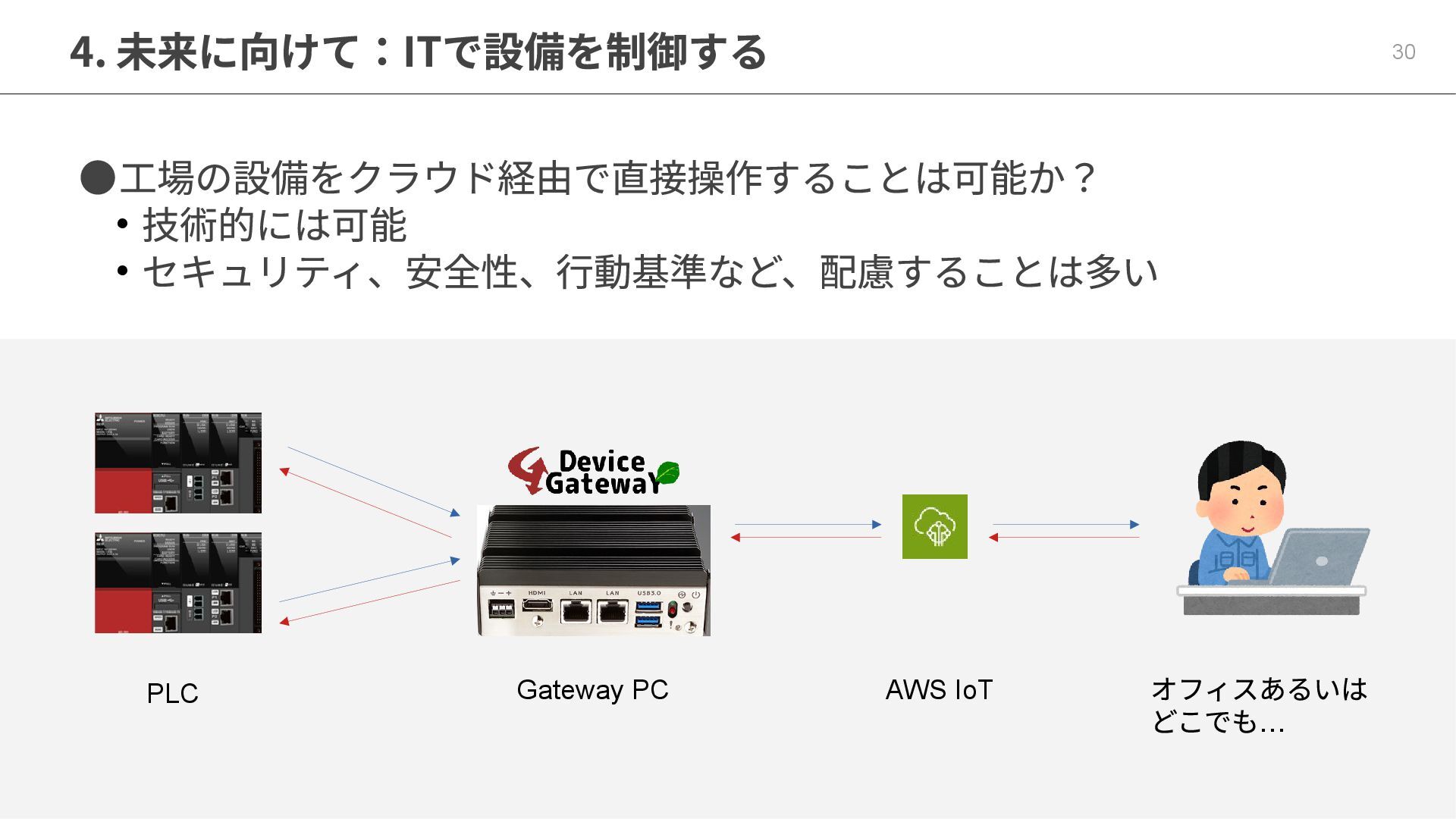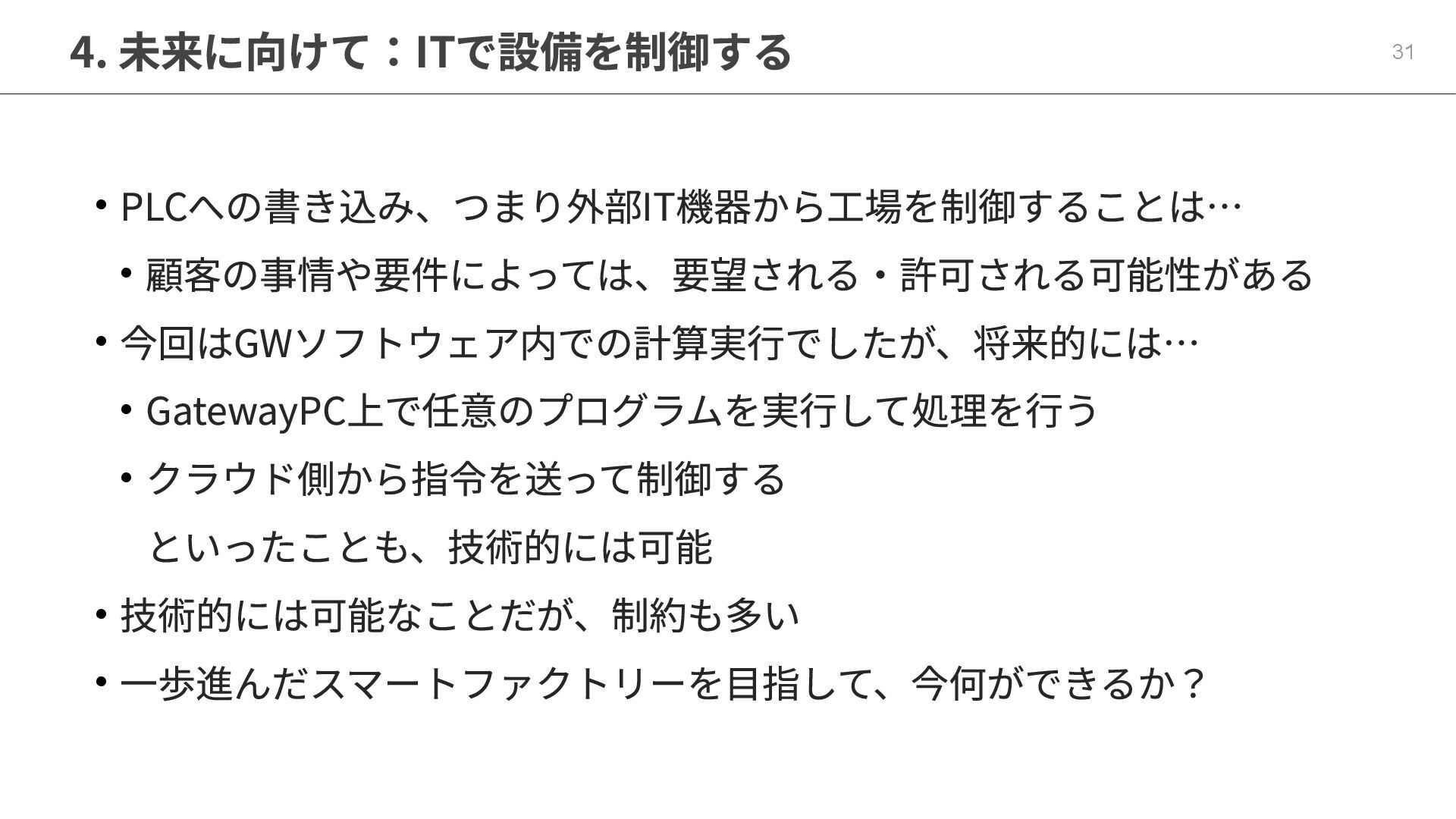 23. 4. 未来に向けて:ITで設備を制御する 31  PLCへの書き込み、つまり外部IT機器から工場を制御することは…  顧客の事情や要件によっては、要 望される・許可される可能性がある  今回は