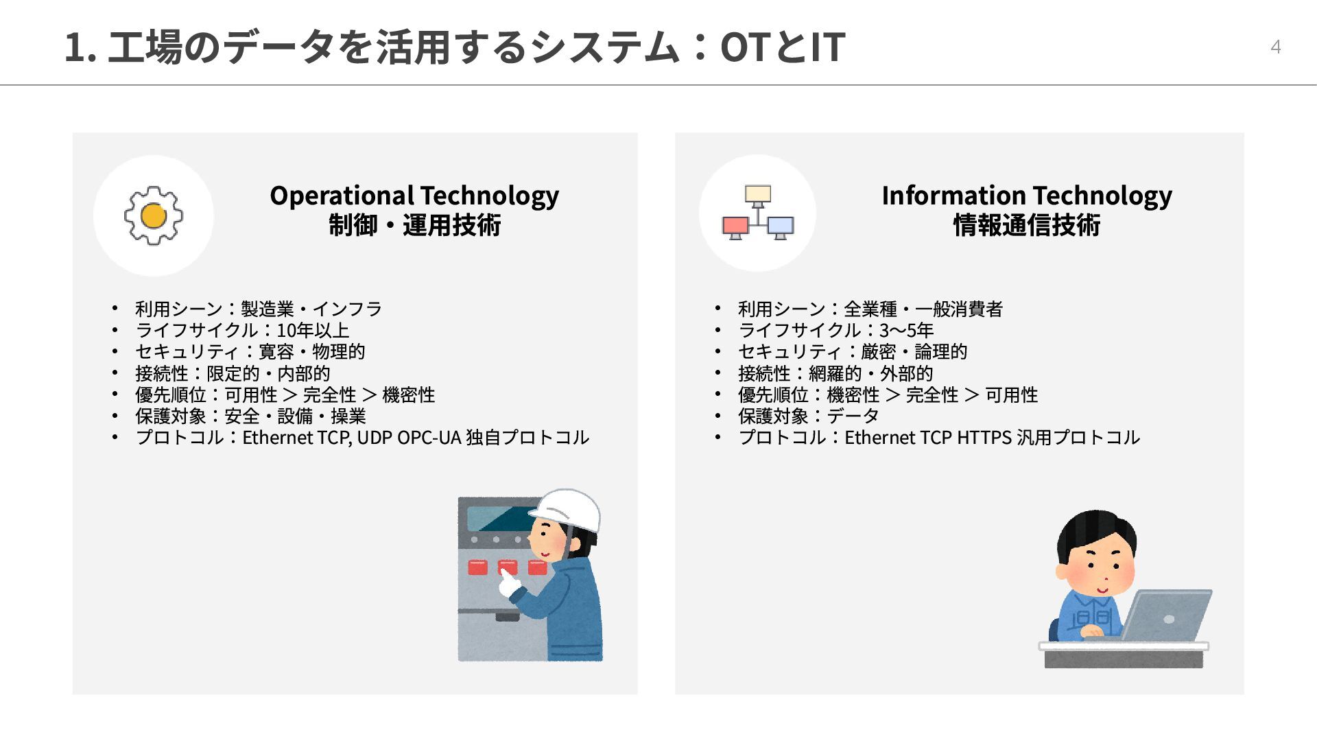 2. 1. 工場のデータを活用するシステム:OTとIT 4 Operational Technology 制御・運用技術  利用シーン:製造業・インフラ  ライフサイクル:10年以上