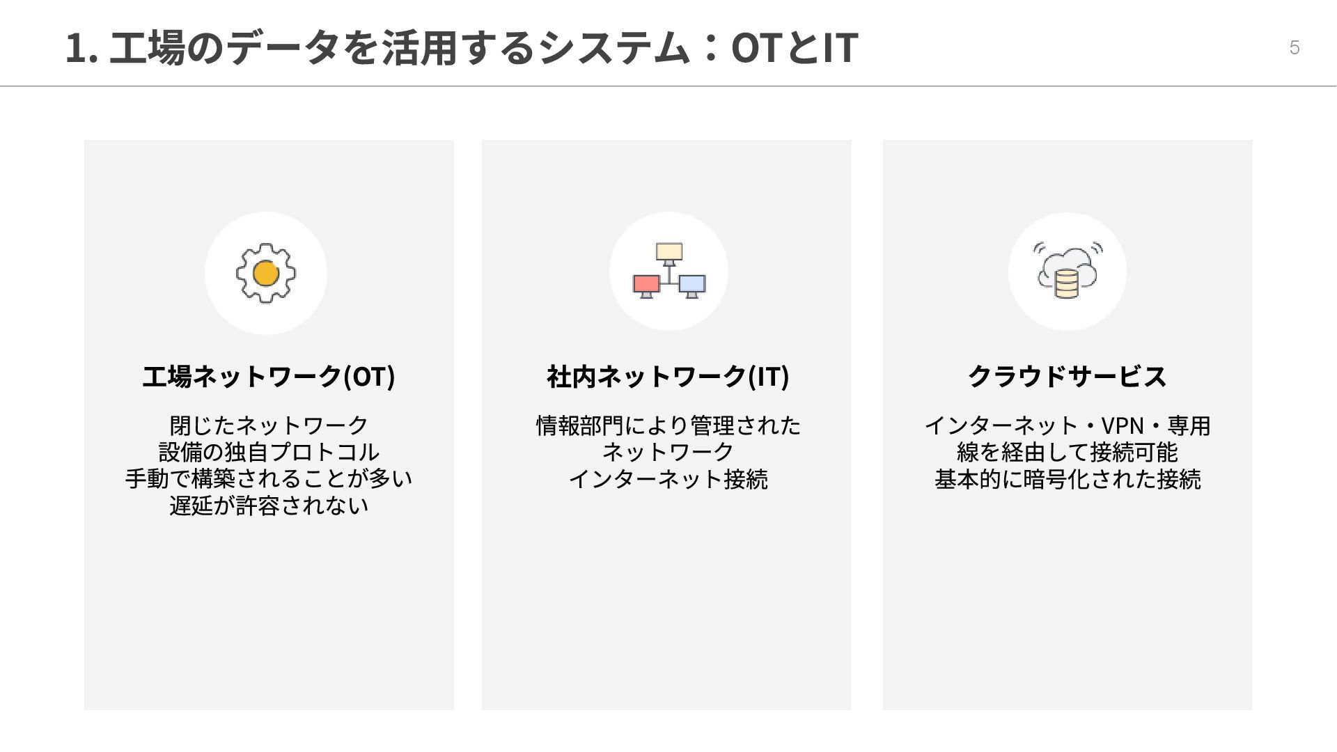 5. 1. 工場のデータを活用するシステム:OTとIT 7 工場ネットワーク(OT) 社内ネットワーク(IT) クラウドサービス 閉じたネットワーク 設備の独自プロトコル 手動で構築されることが多い 遅延が許容されない