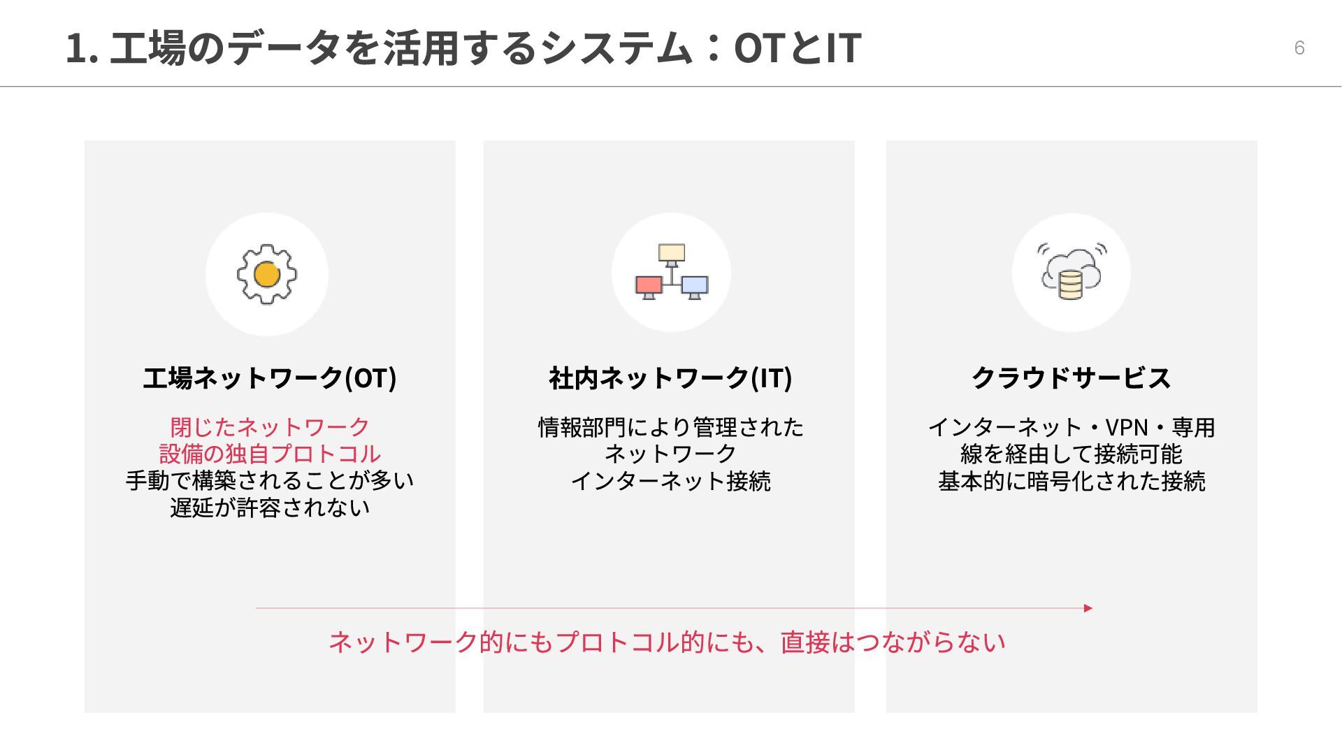 3. 1. 工場のデータを活用するシステム:OTとIT 5 工場ネットワーク(OT) 社内ネットワーク(IT) クラウドサービス 閉じたネットワーク 設備の独自プロトコル 手動で構築されることが多い 遅延が許容されない