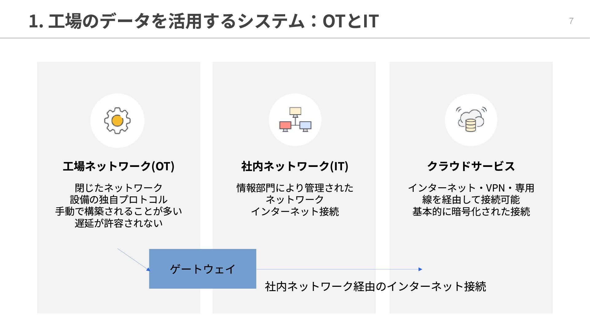7. 1. 工場のデータを活用するシステム:OTとIT 9 工場ネットワーク(OT) 社内ネットワーク(IT) クラウドサービス 閉じたネットワーク 設備の独自プロトコル 手動で構築されることが多い 遅延が許容されない