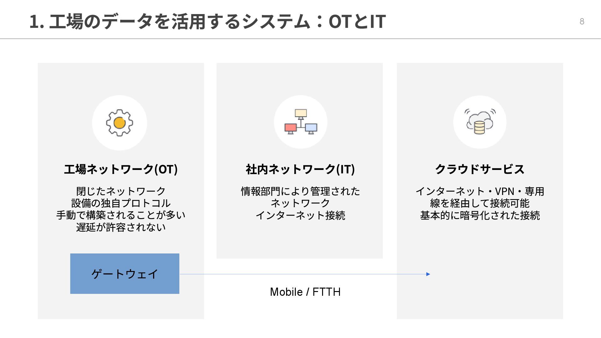 8. 1. 工場のデータを活用するシステム:OTとIT 10  現時点では、多くの場合…(例外はあります)  工場ネットワークとクラウドは直接つながらない  クラウド上にゲートウェイを置く場合、留意事項が多い 