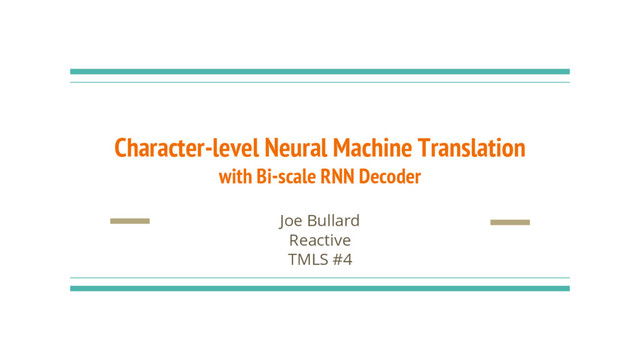 Machine translation systems typically rely on pre-segmented words as inputs. However, word segmentation is not always a trivial task (e.g. Japanese), and some arguments made in its favor may be less relevant for modern Neural Machine Translation (NMT). A recent paper presented interesting results for *character-level* translation using a novel "Bi-scale RNN" decoder, which processes inputs at two time-scales. This presentation will cover basics of NMT, explain the structure of the Bi-scale RNN, and discuss some language specific considerations for Japanese translation.