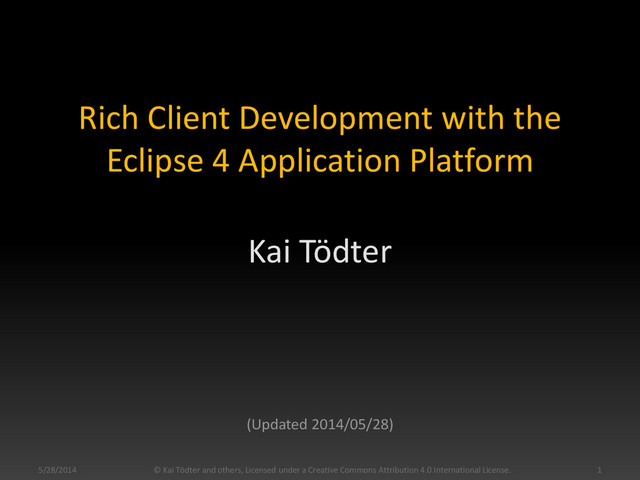 This is the slide deck I use for my one day Eclipse 4 tutorial. See http://toedter.com/training/. You find the corresponding reference implementations of the labs and some code snippets at https://github.com/toedter/e4-tutorial. This work is licensed under a Creative Commons Attribution 4.0 International License.