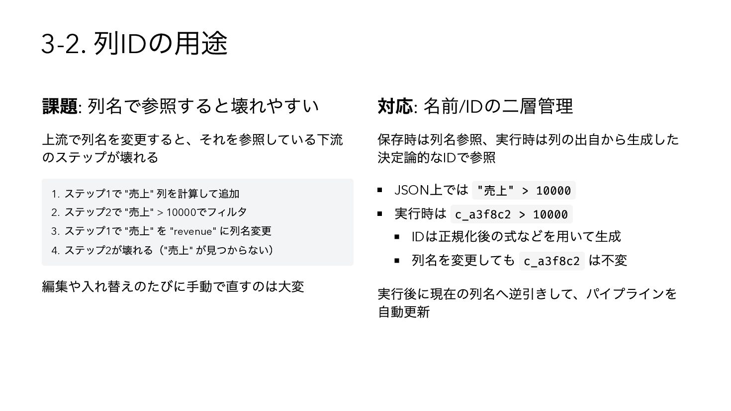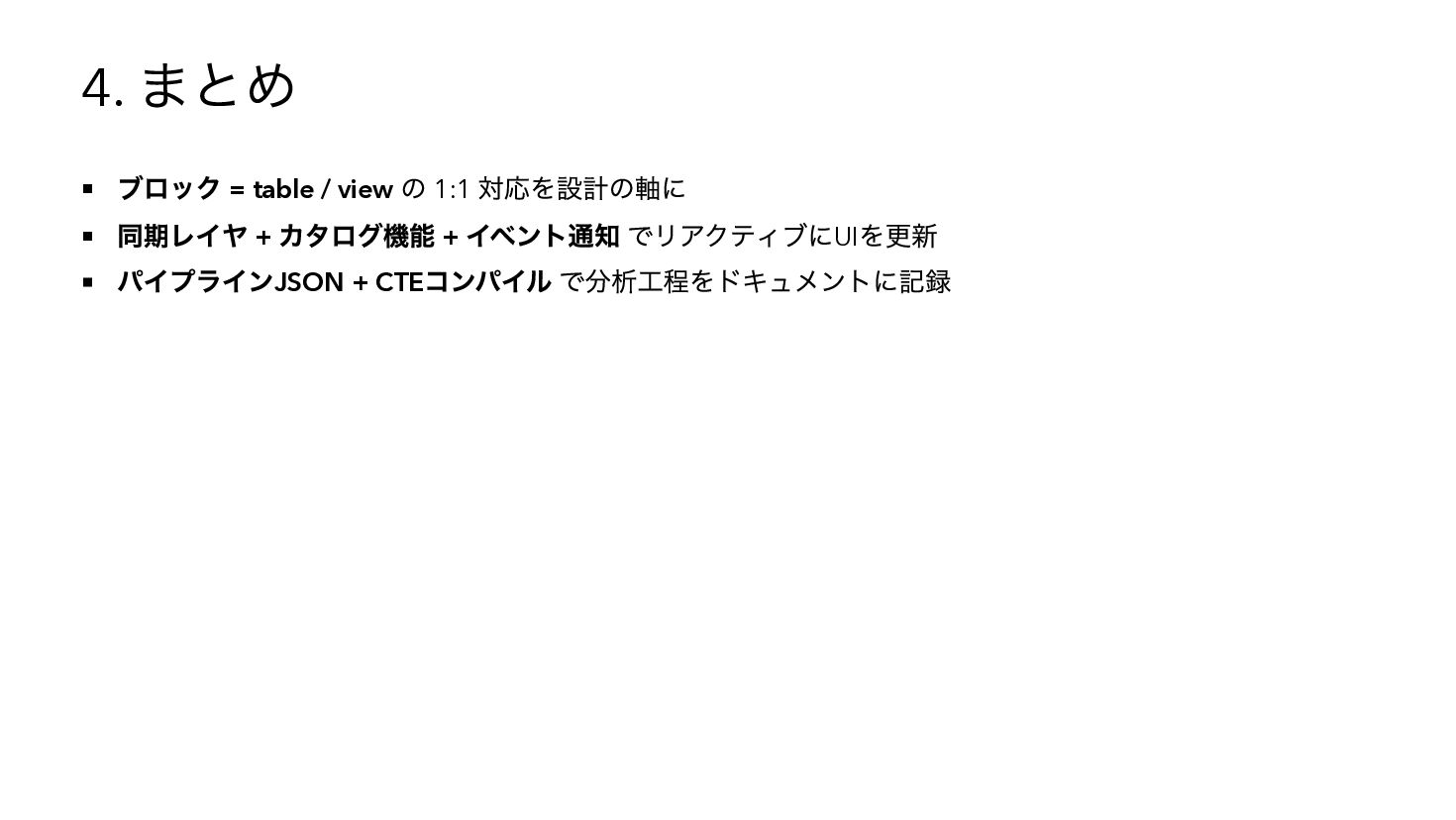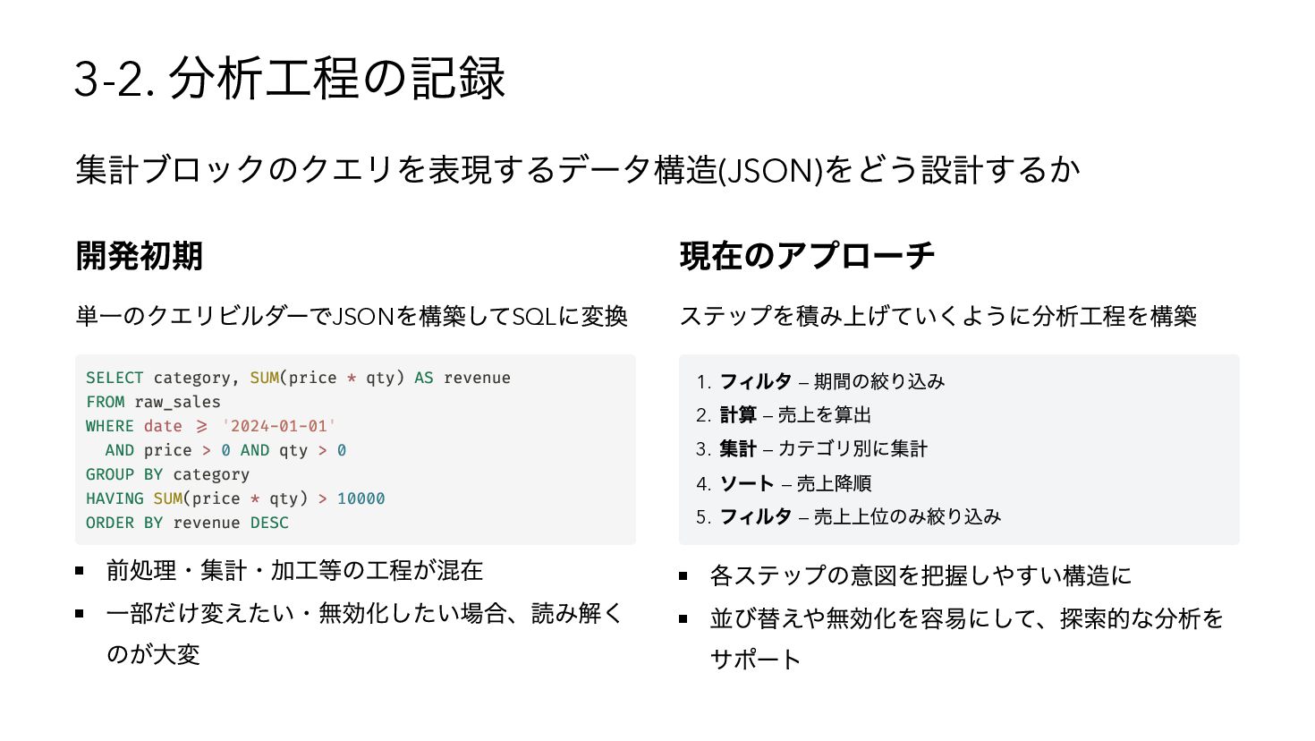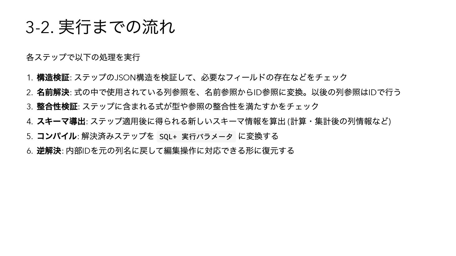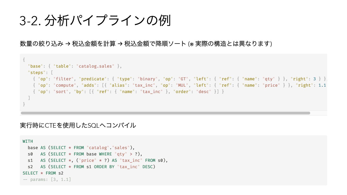 を使用したSQL へコンパイル { "base": { "table": "catalog.sales" }, "steps": [ { "op": "filter", "predicate": { "type": "binary", "op": "GT", "left": { "ref": { "name": "qty" } }, "right": 3 } }, { "op": "compute", "adds": [{ "alias": "tax_inc", "op": "MUL", "left": { "ref": { "name": "price" } }, "right": 1.1 { "op": "sort", "by": [{ "ref": { "name": "tax_inc" }, "order": "desc" }] } ] } WITH base AS (SELECT * FROM "catalog"."sales"), s0 AS (SELECT * FROM base WHERE "qty" > ?), s1 AS (SELECT *, ("price" * ?) AS "tax_inc" FROM s0), s2 AS (SELECT * FROM s1 ORDER BY "tax_inc" DESC) SELECT * FROM s2 -- params: [3, 1.1]