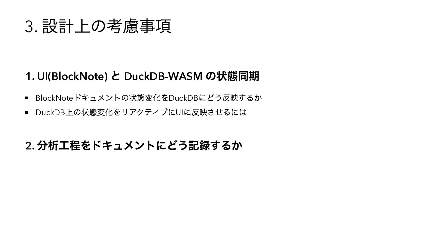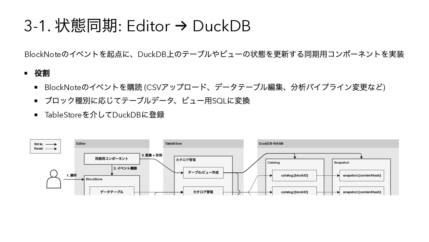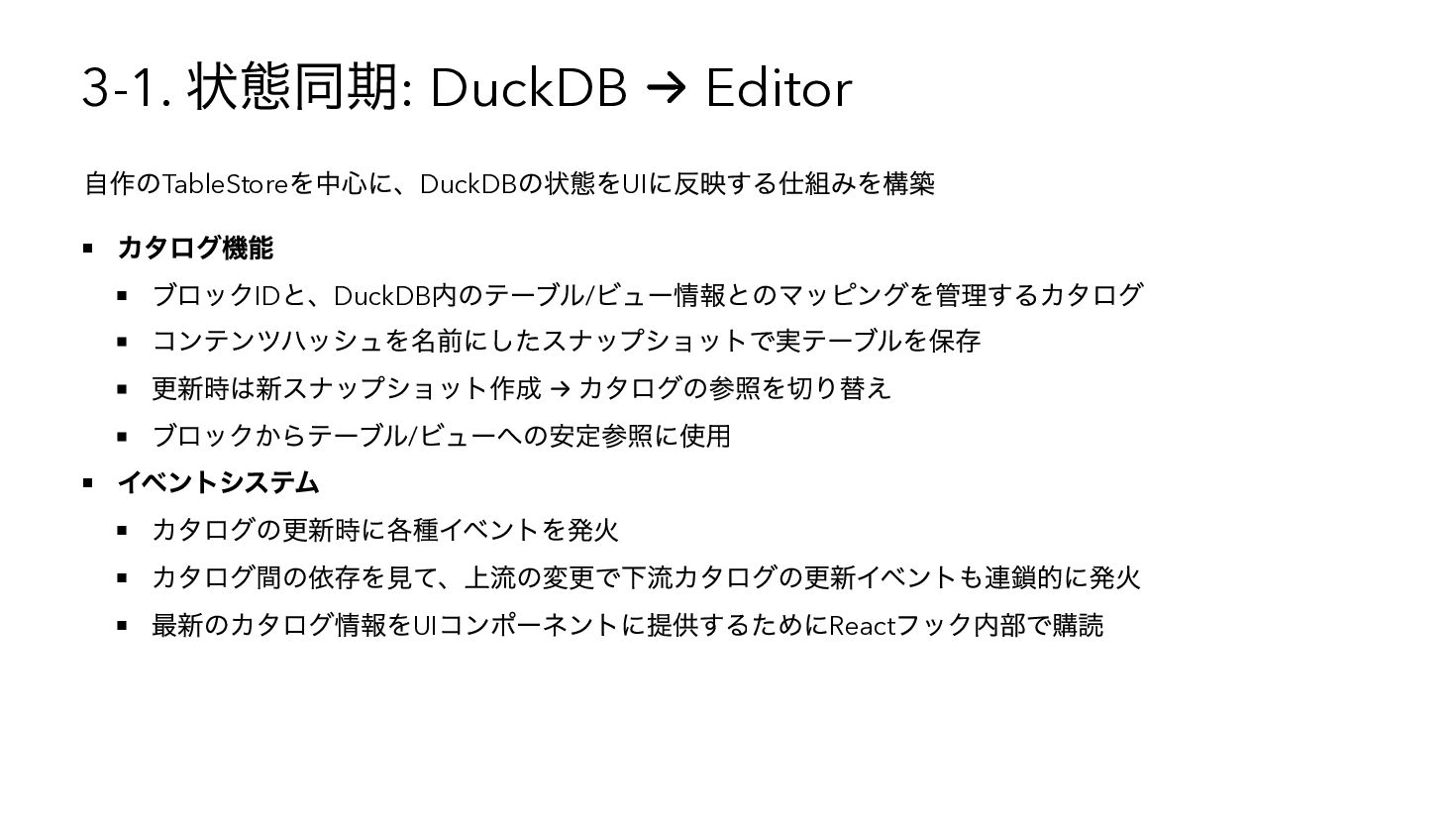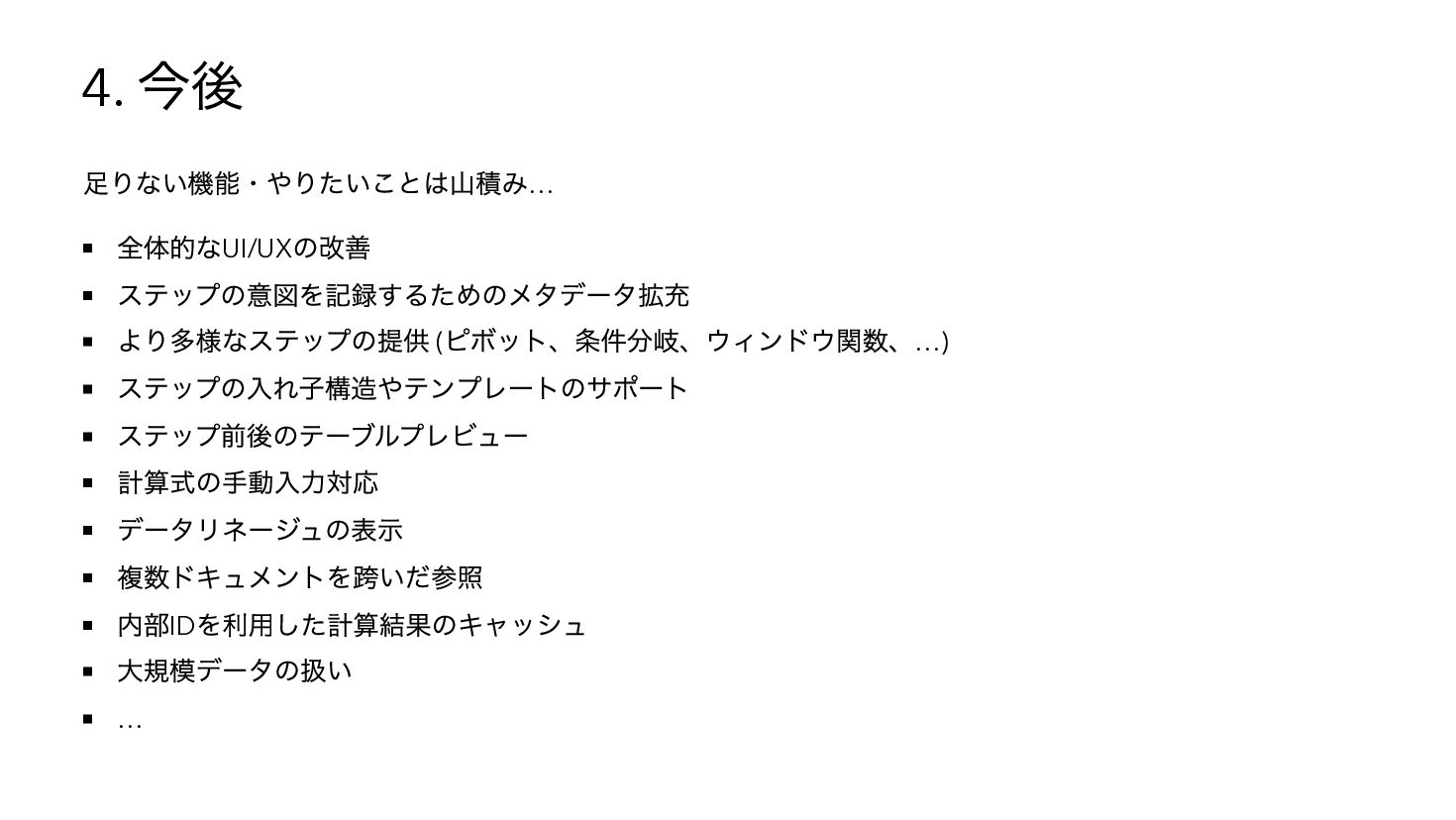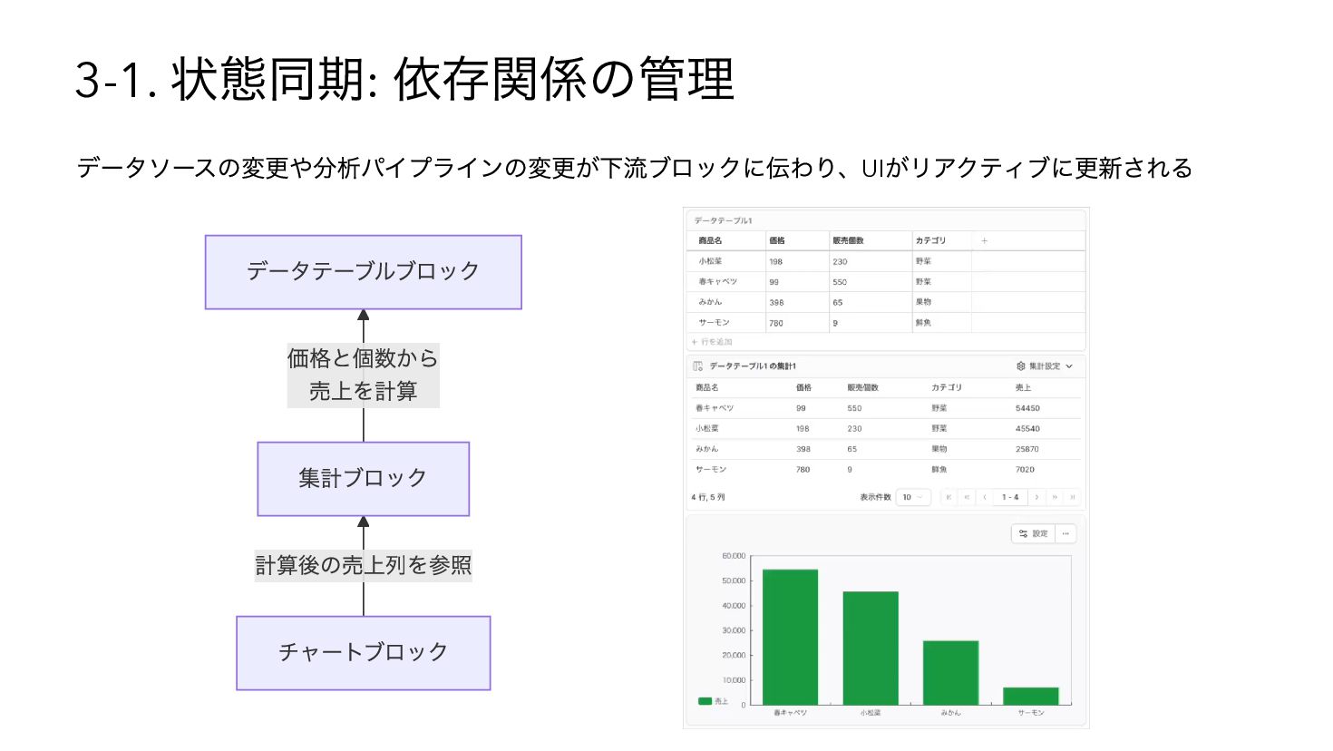 を使用したSQL へコンパイル { "base": { "table": "catalog.sales" }, "steps": [ { "op": "filter", "predicate": { "type": "binary", "op": "GT", "left": { "ref": { "name": "qty" } }, "right": 3 } }, { "op": "compute", "adds": [{ "alias": "tax_inc", "op": "MUL", "left": { "ref": { "name": "price" } }, "right": 1.1 { "op": "sort", "by": [{ "ref": { "name": "tax_inc" }, "order": "desc" }] } ] } WITH base AS (SELECT * FROM "catalog"."sales"), s0 AS (SELECT * FROM base WHERE "qty" > ?), s1 AS (SELECT *, ("price" * ?) AS "tax_inc" FROM s0), s2 AS (SELECT * FROM s1 ORDER BY "tax_inc" DESC) SELECT * FROM s2 -- params: [3, 1.1]