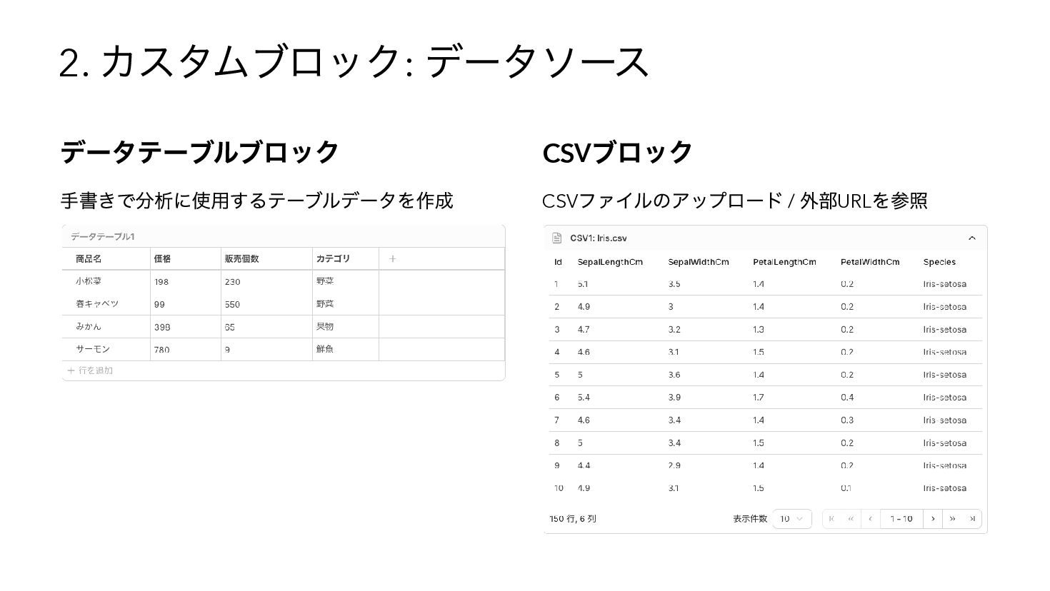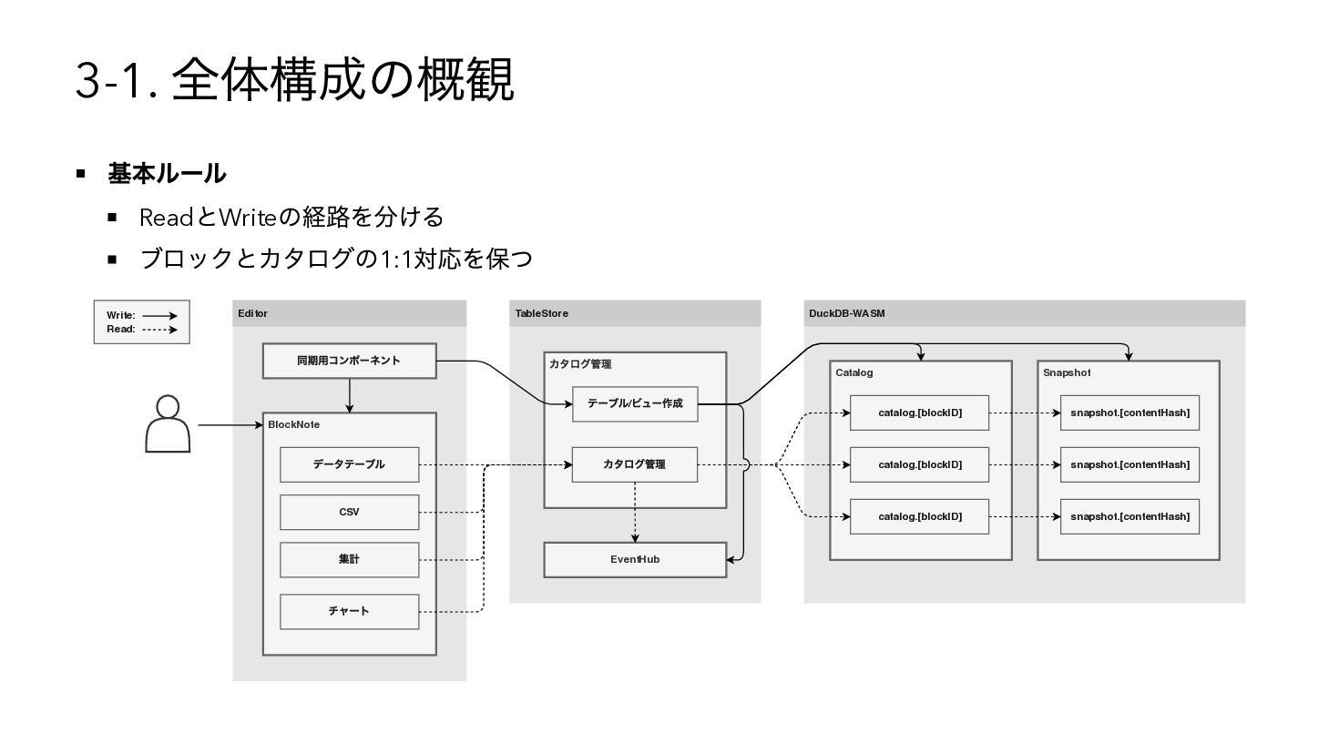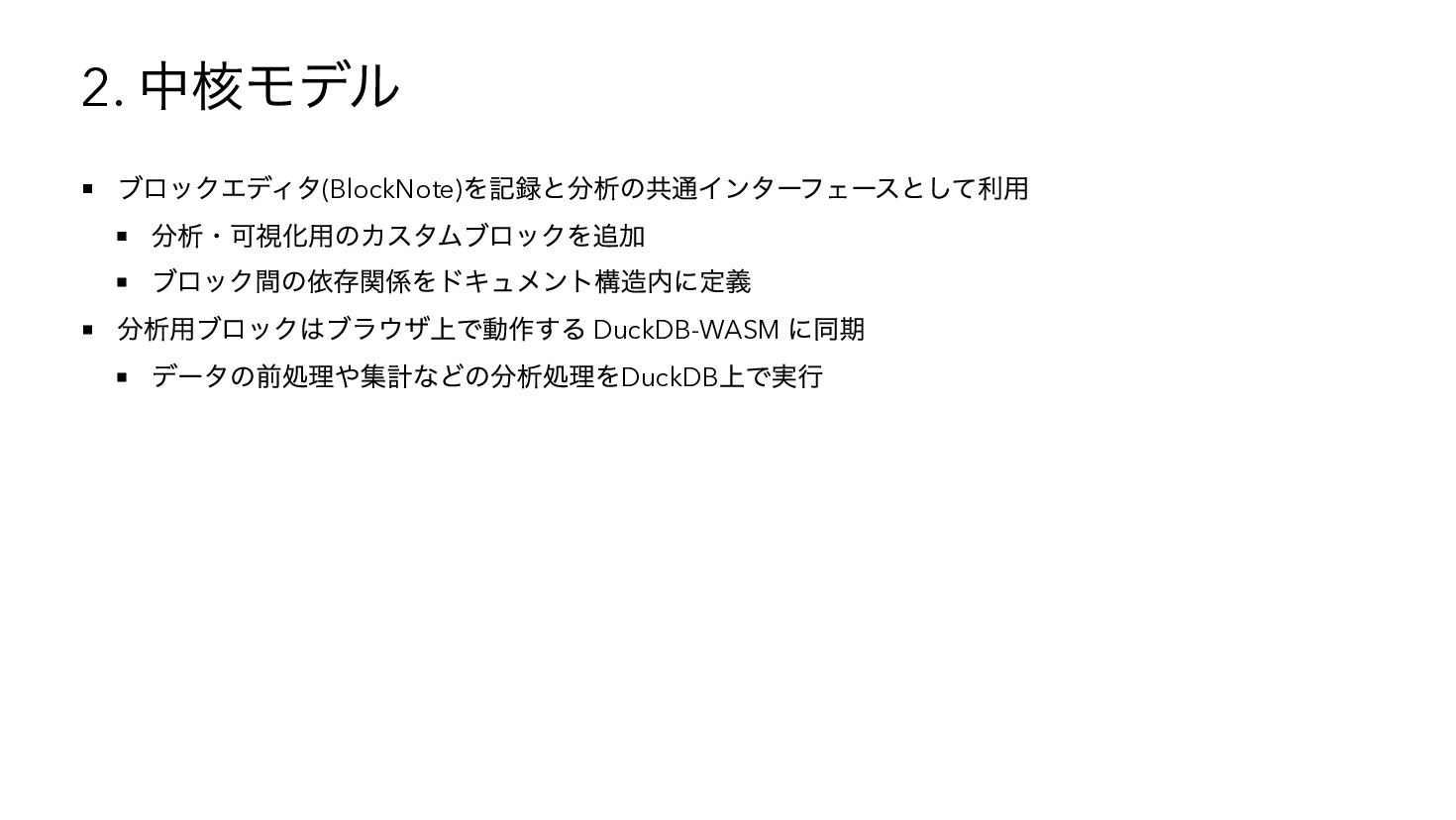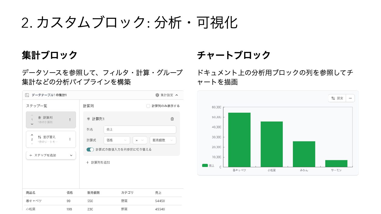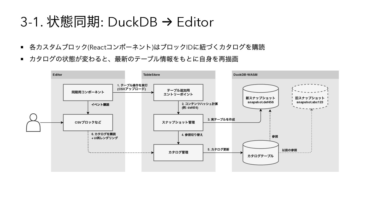 を使用したSQL へコンパイル { "base": { "table": "catalog.sales" }, "steps": [ { "op": "filter", "predicate": { "type": "binary", "op": "GT", "left": { "ref": { "name": "qty" } }, "right": 3 } }, { "op": "compute", "adds": [{ "alias": "tax_inc", "op": "MUL", "left": { "ref": { "name": "price" } }, "right": 1.1 { "op": "sort", "by": [{ "ref": { "name": "tax_inc" }, "order": "desc" }] } ] } WITH base AS (SELECT * FROM "catalog"."sales"), s0 AS (SELECT * FROM base WHERE "qty" > ?), s1 AS (SELECT *, ("price" * ?) AS "tax_inc" FROM s0), s2 AS (SELECT * FROM s1 ORDER BY "tax_inc" DESC) SELECT * FROM s2 -- params: [3, 1.1]