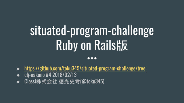 situated-program-challenge Ruby on Rails版 • https://github.com/toku345/situated-program-challenge/tree • clj-nakano #4 2018/02/13