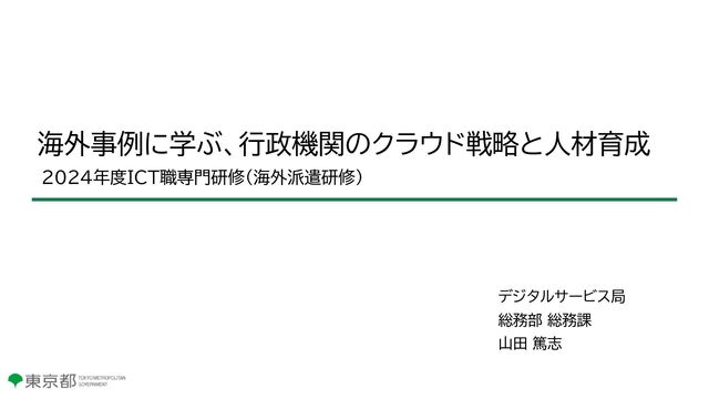 Service 2018年に新たにクラウド戦略とポリシーを策定。 戦略の中で成功指標としていた、 2023年度までに政府の デジタルサービスの25%をパブリッククラウドに転換する 目標を達成するなど、クラウド転換を効果的に進めている。 これまでのクラウド転換の経験や都のクラウド施策を紹介し、 現在の課題や今後の目標等についてディスカッションした。 参考:Digital NSW Cloud strategy and policy https://www.digital.nsw.gov.au/policy/cloud-strategy-and-policy 当日ご対応いただいたNSW州政府の職員様 右から T. Jagadeeson, P. McMillan and A. Pathak https://www.nsw.gov.au/