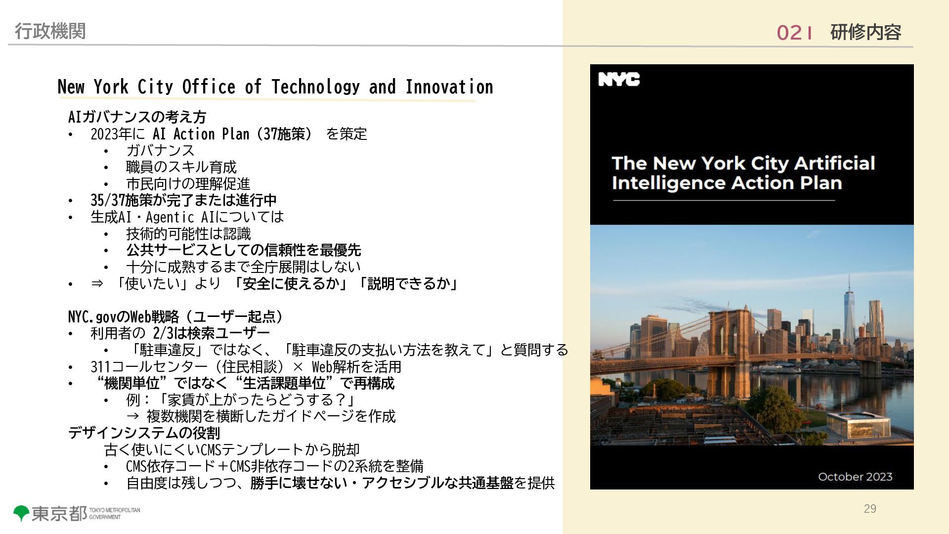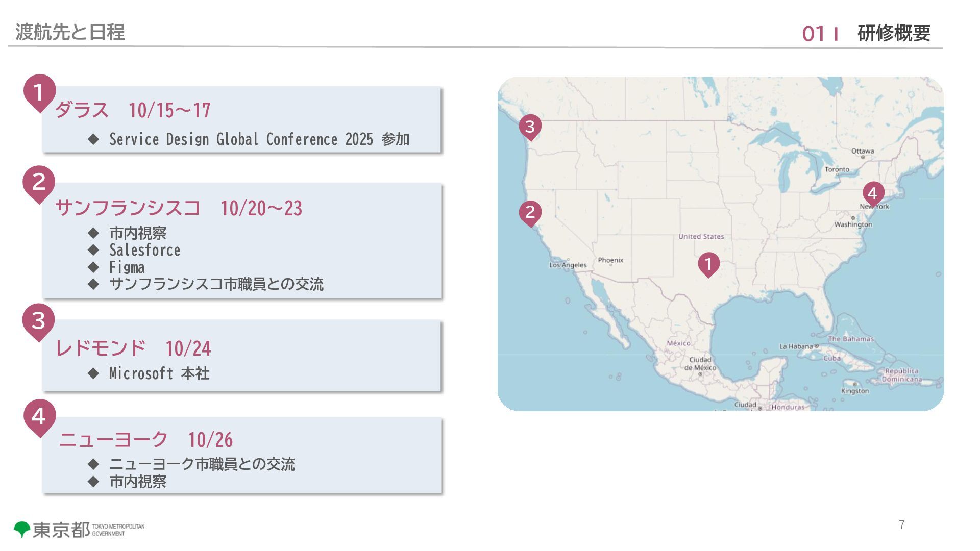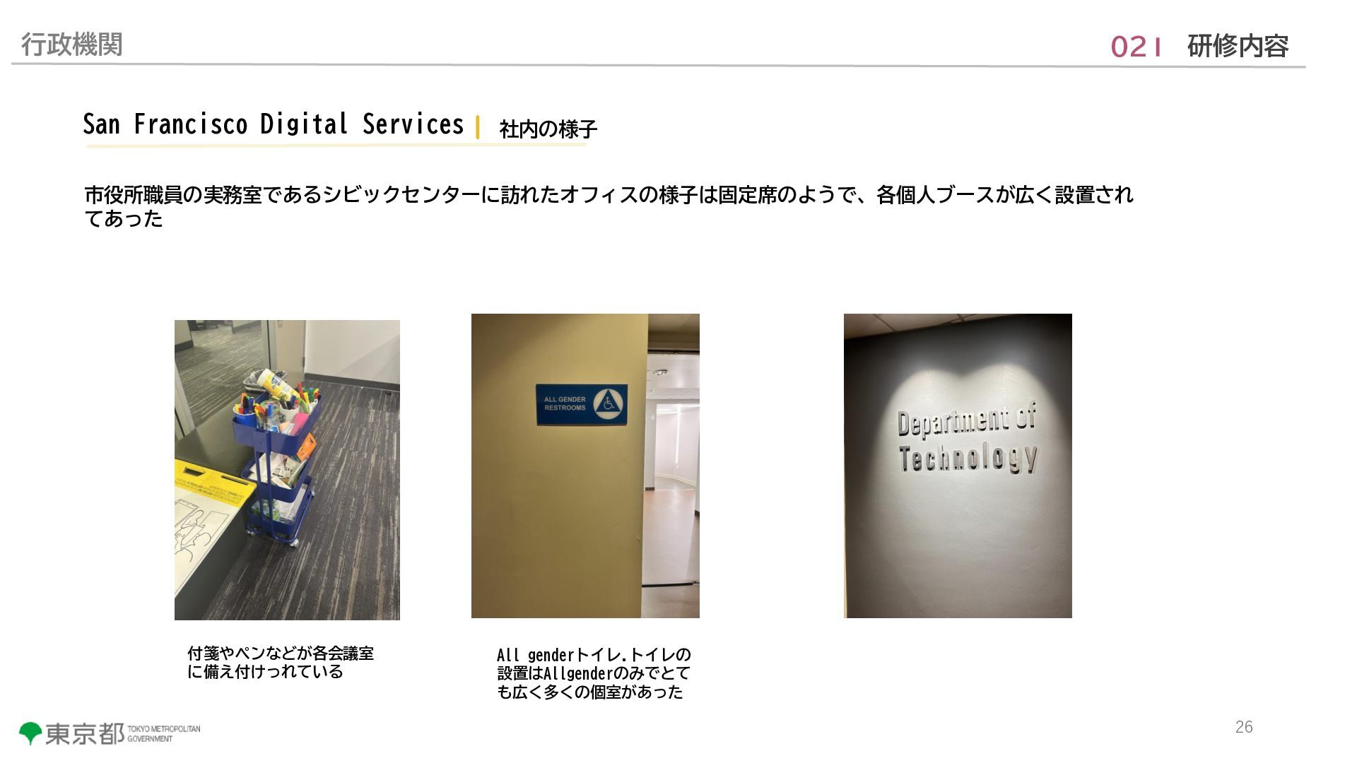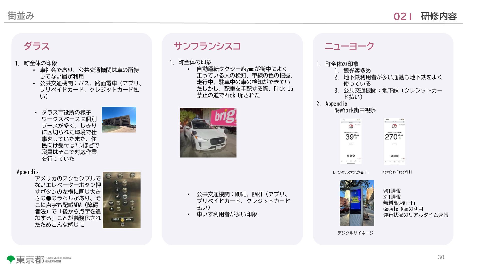 公共交通機関:バス、路面電車(アプリ、 プリペイドカード、クレジットカード払 い) • ダラス市役所の様子 ワークスペースは個別 ブースが多く、しきり に区切られた環境で仕 事をしていたまた、住 民向け受付は7つほどで 職員はそこで対応作業 を行っていた Appendix アメリカのアクセシブルで ないエレベーターボタン押 すボタンの左横に同じ大き さの•のラべルがあり、そ こに点字も記載ADA(障碍 者法)で「後から点字を追 加する」ことが義務化され たためこんな感じに サンフランシスコ 1. 町全体の印象 • 自動運転タクシーWaymoが街中によく 走っている人の検知、車線の色の把握、 走行中、駐車中の車の検知ができてい たしかし、配車を手配する際、Pick Up 禁止の道でPick Upされた • 公共交通機関:MUNI, BART(アプリ、 プリペイドカード、クレジットカード 払い) • 車いす利用者が多い印象 ニューヨーク 1. 町全体の印象 1. 観光客多め 2. 地下鉄利用者が多い通勤も地下鉄をよく 使っている 3. 公共交通機関:地下鉄(クレジットカー ド払い) 2. Appendix NewYork街中視察 レンタルされたWifi NewYorkFreeWifi デジタルサイネージ 991通報 311通報 無料高速Wi-Fi Google Mapの利用 運行状況のリアルタイム速報 30