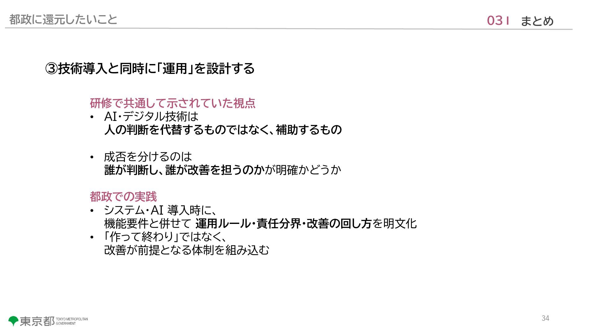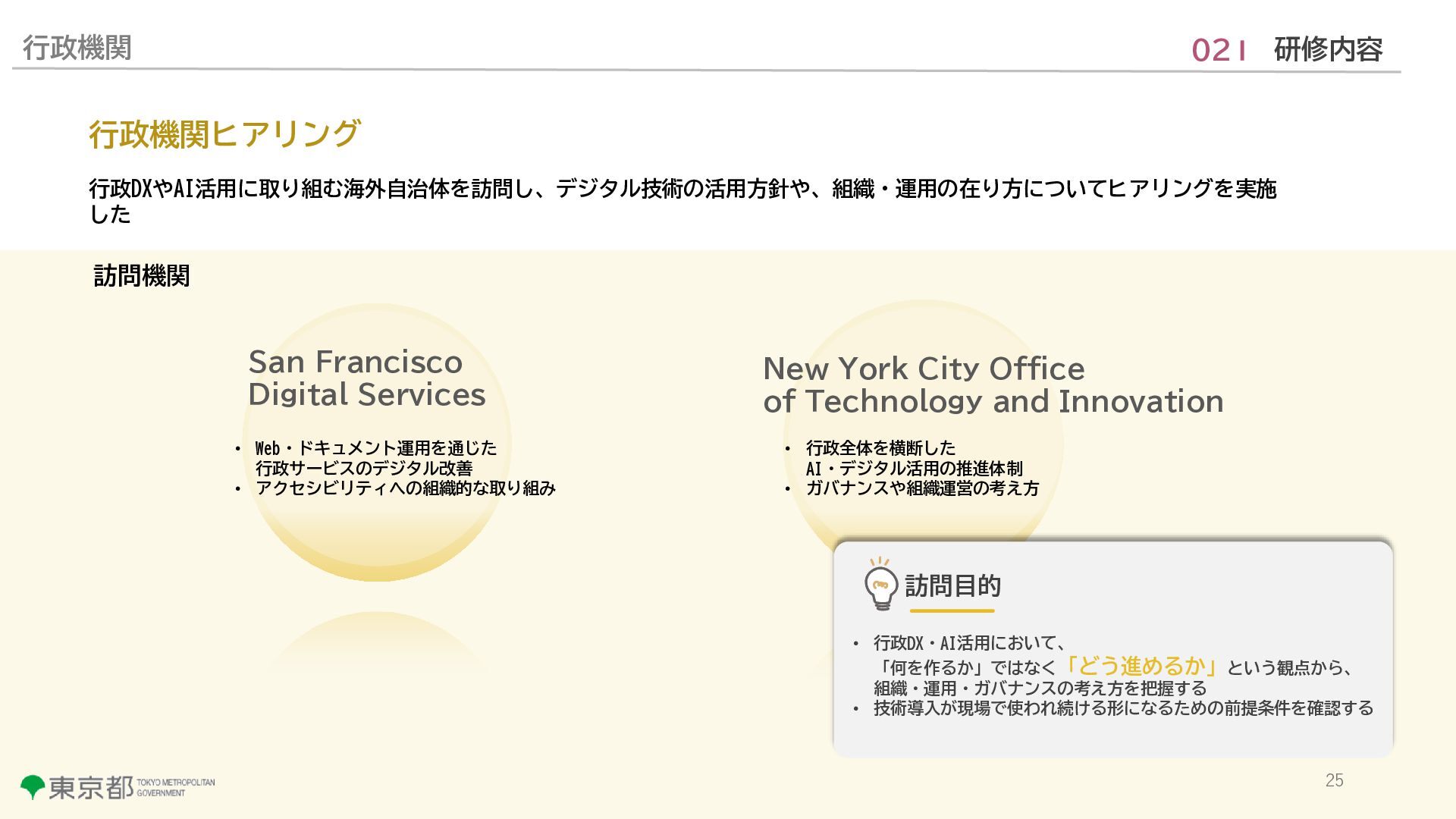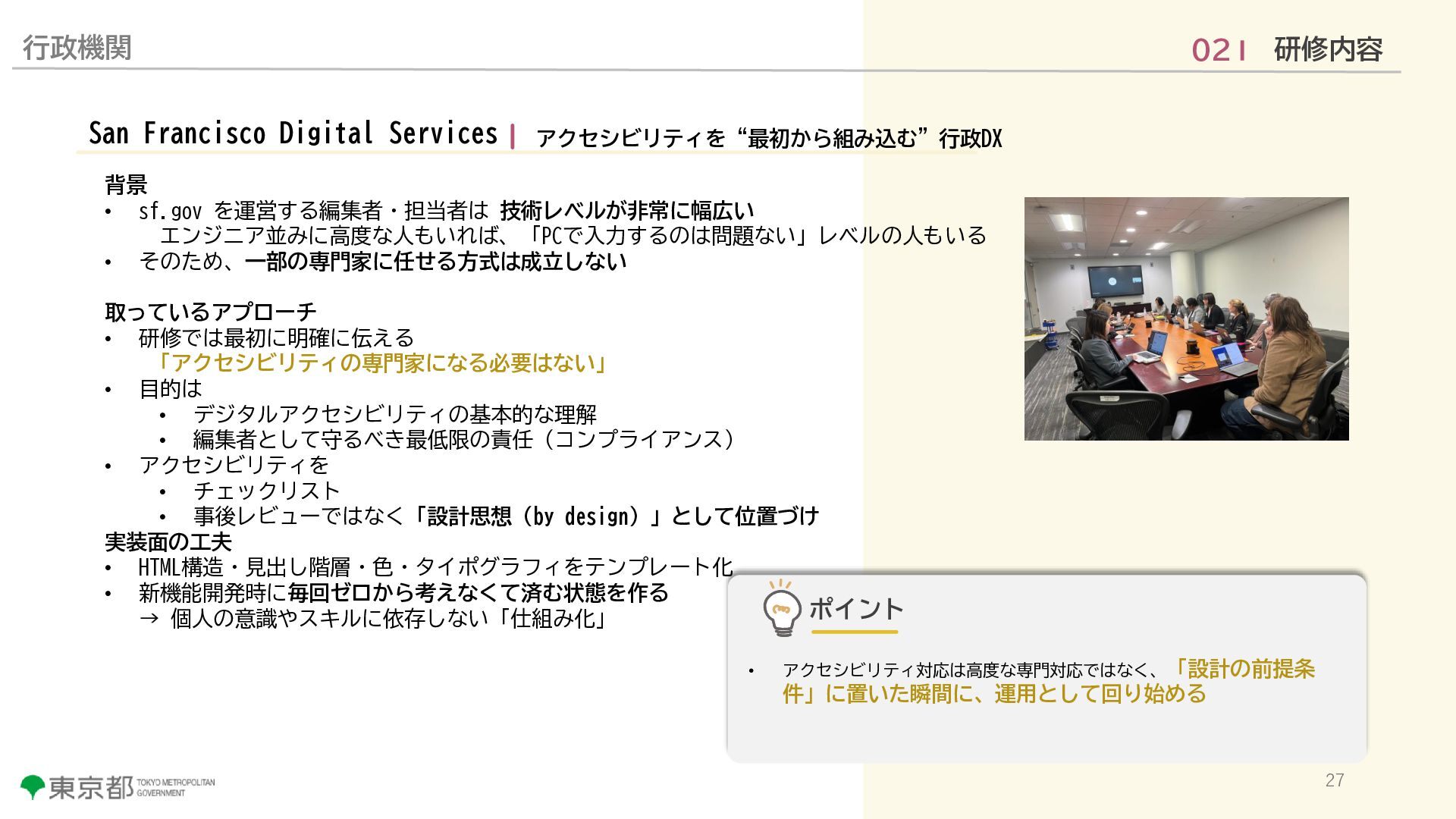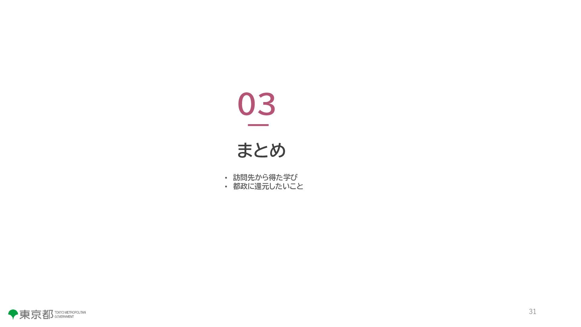 公共交通機関:バス、路面電車(アプリ、 プリペイドカード、クレジットカード払 い) • ダラス市役所の様子 ワークスペースは個別 ブースが多く、しきり に区切られた環境で仕 事をしていたまた、住 民向け受付は7つほどで 職員はそこで対応作業 を行っていた Appendix アメリカのアクセシブルで ないエレベーターボタン押 すボタンの左横に同じ大き さの•のラべルがあり、そ こに点字も記載ADA(障碍 者法)で「後から点字を追 加する」ことが義務化され たためこんな感じに サンフランシスコ 1. 町全体の印象 • 自動運転タクシーWaymoが街中によく 走っている人の検知、車線の色の把握、 走行中、駐車中の車の検知ができてい たしかし、配車を手配する際、Pick Up 禁止の道でPick Upされた • 公共交通機関:MUNI, BART(アプリ、 プリペイドカード、クレジットカード 払い) • 車いす利用者が多い印象 ニューヨーク 1. 町全体の印象 1. 観光客多め 2. 地下鉄利用者が多い通勤も地下鉄をよく 使っている 3. 公共交通機関:地下鉄(クレジットカー ド払い) 2. Appendix NewYork街中視察 レンタルされたWifi NewYorkFreeWifi デジタルサイネージ 991通報 311通報 無料高速Wi-Fi Google Mapの利用 運行状況のリアルタイム速報 30
