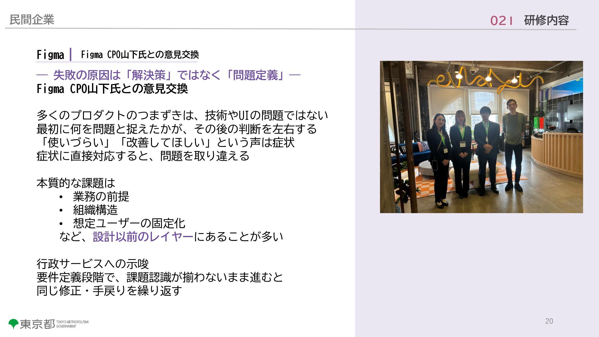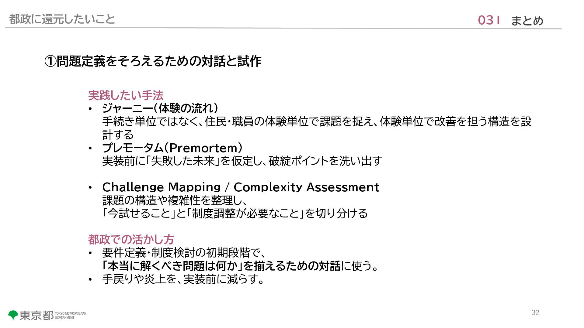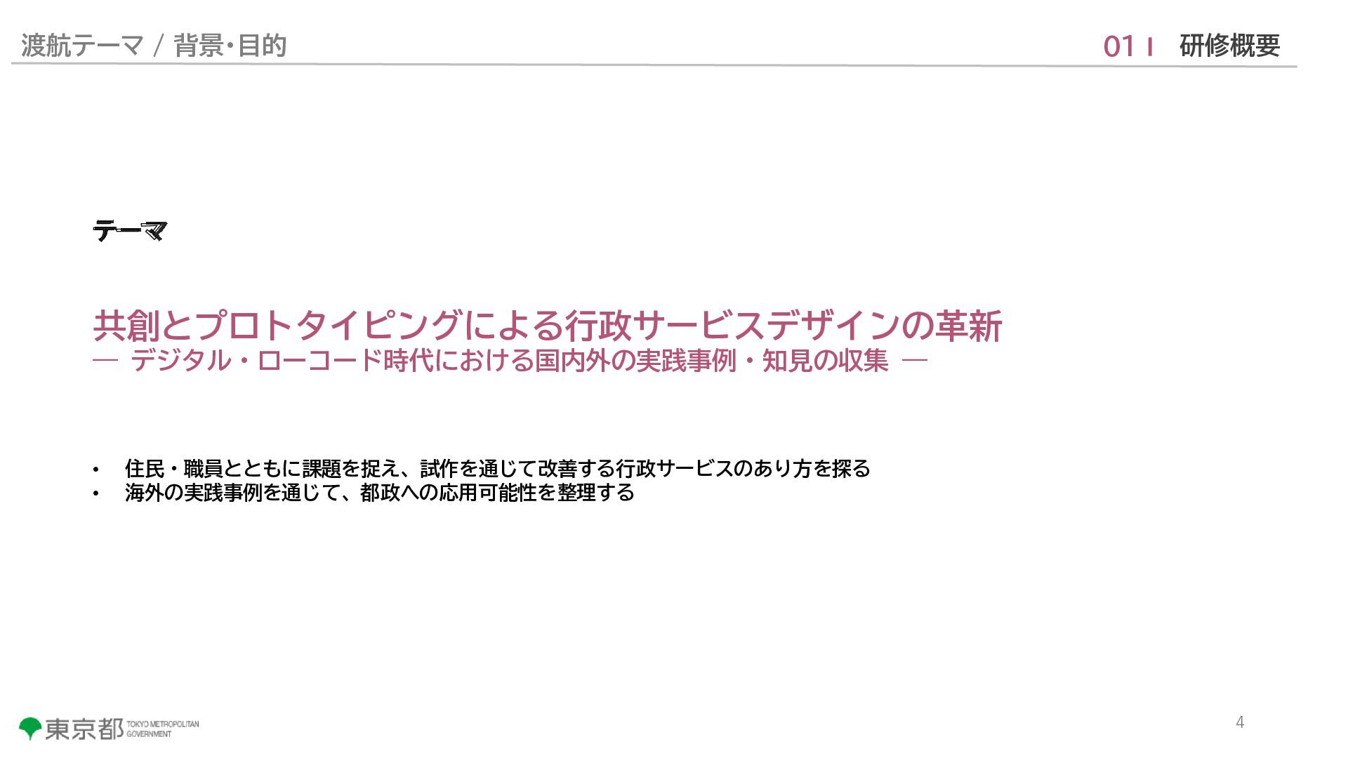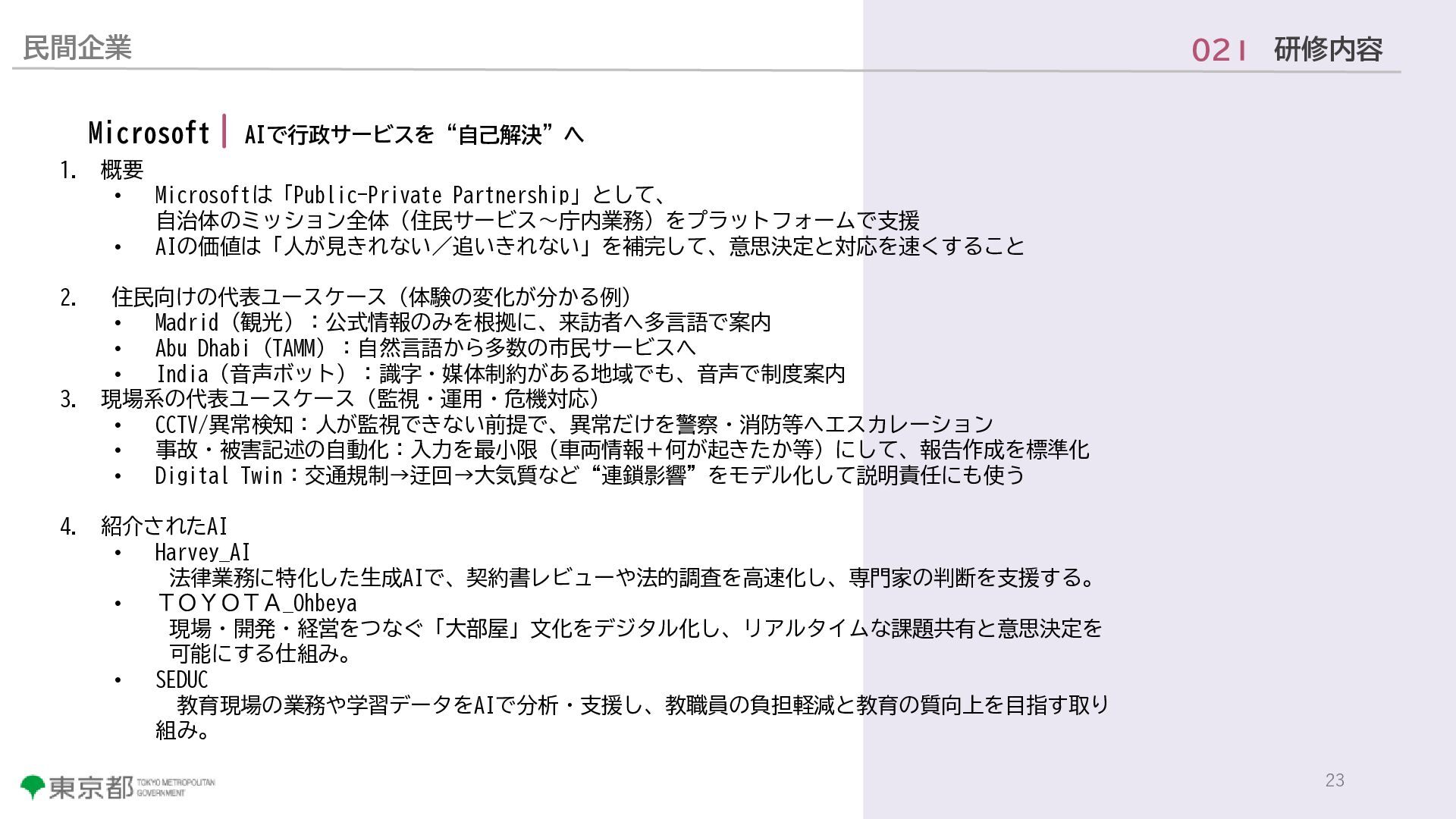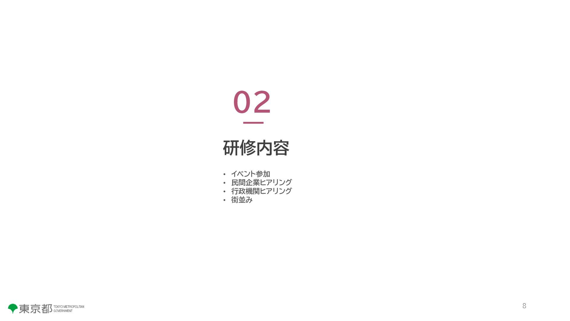 公共交通機関:バス、路面電車(アプリ、 プリペイドカード、クレジットカード払 い) • ダラス市役所の様子 ワークスペースは個別 ブースが多く、しきり に区切られた環境で仕 事をしていたまた、住 民向け受付は7つほどで 職員はそこで対応作業 を行っていた Appendix アメリカのアクセシブルで ないエレベーターボタン押 すボタンの左横に同じ大き さの•のラべルがあり、そ こに点字も記載ADA(障碍 者法)で「後から点字を追 加する」ことが義務化され たためこんな感じに サンフランシスコ 1. 町全体の印象 • 自動運転タクシーWaymoが街中によく 走っている人の検知、車線の色の把握、 走行中、駐車中の車の検知ができてい たしかし、配車を手配する際、Pick Up 禁止の道でPick Upされた • 公共交通機関:MUNI, BART(アプリ、 プリペイドカード、クレジットカード 払い) • 車いす利用者が多い印象 ニューヨーク 1. 町全体の印象 1. 観光客多め 2. 地下鉄利用者が多い通勤も地下鉄をよく 使っている 3. 公共交通機関:地下鉄(クレジットカー ド払い) 2. Appendix NewYork街中視察 レンタルされたWifi NewYorkFreeWifi デジタルサイネージ 991通報 311通報 無料高速Wi-Fi Google Mapの利用 運行状況のリアルタイム速報 30