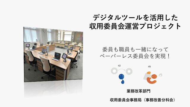 デジタルツールを活用した 収用委員会運営プロジェクト 収用委員会事務局(事務改善分科会) 委員も職員も一緒になって ペーパーレス委員会を実現! 業務改革部門 #2 #9