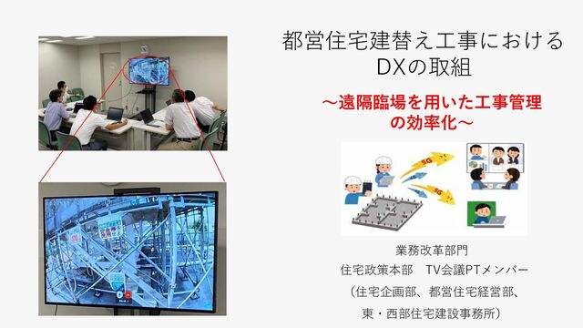 試験及び検査 換気扇運転試験 △ 風量測定は確認できるが、 異音などの確認は難しい 実施対象 実施項目 適応性 理由 ・施工後に検査が困難な箇所の施 工:屋外埋設管 ・監督員指示 共通仕様書1.2.4 原形復旧工事の立会 い ▼ トラブル対応のため、現地立ち合いに よる確認が必要 共通仕様書3.3.9 試験、検査及び消毒 ・給水管水圧試験 〇 共通仕様書4.3.8 試験及び検査 ・排水管満水試験 〇 共通仕様書7.3.4 試験及び検査 ・換気扇類運転試験 △ 風量測定は確認できるが、がたつき、 異常音の確認は難しい 共通事項 共通仕様書1.3.4 機材の検査等 ・材料搬入確認 〇 共通仕様書3.3.9 試験、検査及び消毒 「監督職員の立会い」に記載あり 〇 共通仕様書4.3.8 試験及び検査 「監督職員の立会い」に記載あり 〇 ・補助用高架水槽の満水試験 ・連結送水管水圧試験 共通仕様書7.3.4 試験及び検査 「監督職員の立会い」に記載あり △ 水質試験(残留塩素等)での試薬によ る色の変化の確認が難しい 関連工事 等の調整 共通事項 標準仕様書1.1.1.11 別契約の関連工事 △ 別契約との連携に際しては調整次第 項目 監督員と 協議 監督員の 検査 その他事項 共通事項 各種協議 監督員との調整等 〇 共通事項 標準仕様書1.1.5.4 施工の立会い等 〇 その他事項 共通仕様書6.3.7 試験及び検査 〇 監督職員 の立会い ☀ 建築・機械・電気の全工事において 遠隔臨場の向き不向きを明確にした 住宅独自の実施要領と適応性一覧を作成 受注者との現場検証や意見交換を数多く実施 ユーザー目線の改善実施 ~わかりやすい指標~ before after ☂ どんな工事・項目で遠隔臨場ができる? 適応性一覧(機械工事の例) ◦:向いている △:一部向かないものがある ▼:条件がそろえば可能 ⇒◦、△、▼で適用性を明確化