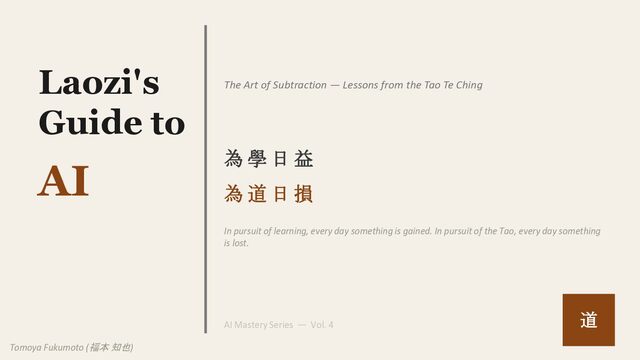 from the Tao Te Ching 為 學 日 益 為 道 日 損 In pursuit of learning, every day something is gained. In pursuit of the Tao, every day something is lost. AI Mastery Series — Vol. 4 道 Tomoya Fukumoto (福本 知也)