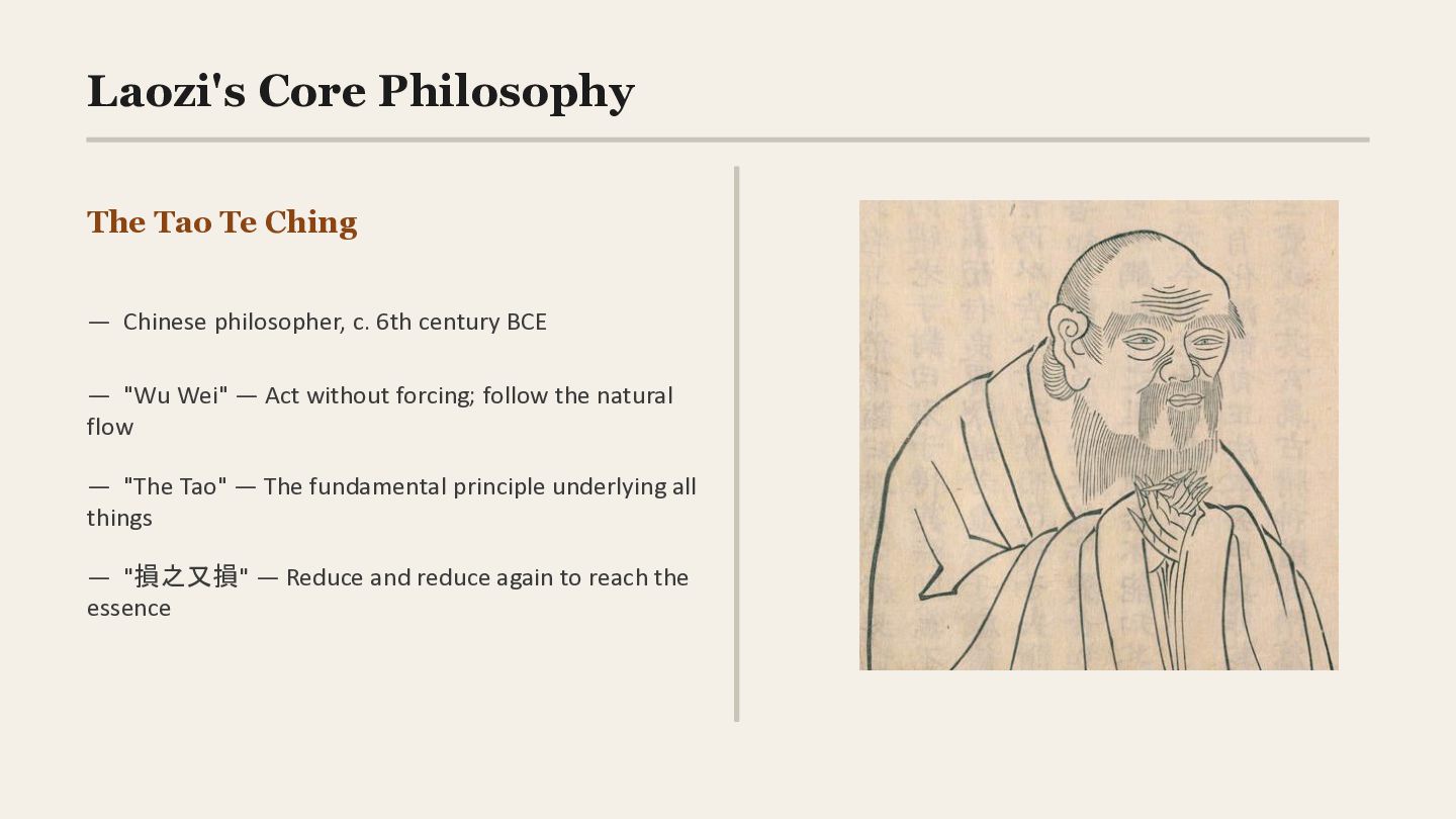 c. 6th century BCE — "Wu Wei" — Act without forcing; follow the natural flow — "The Tao" — The fundamental principle underlying all things — "損之又損" — Reduce and reduce again to reach the essence