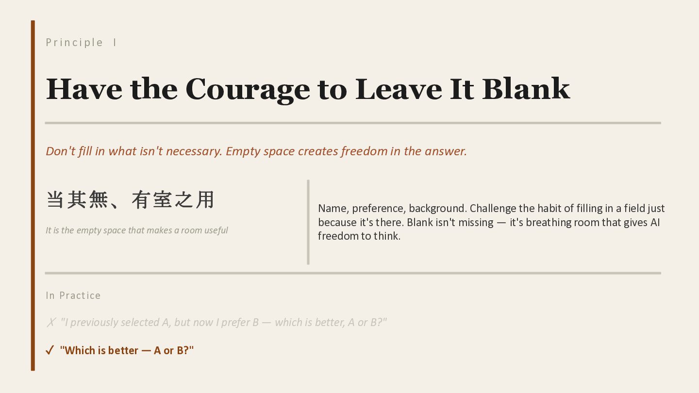 Have the Courage to Leave It Blank Don't fill in what isn't necessary. Empty space creates freedom in the answer. 当其無、有室之用 It is the empty space that makes a room useful Name, preference, background. Challenge the habit of filling in a field just because it's there. Blank isn't missing — it's breathing room that gives AI freedom to think. In Practice ✗ "I previously selected A, but now I prefer B — which is better, A or B?" ✓ "Which is better — A or B?"