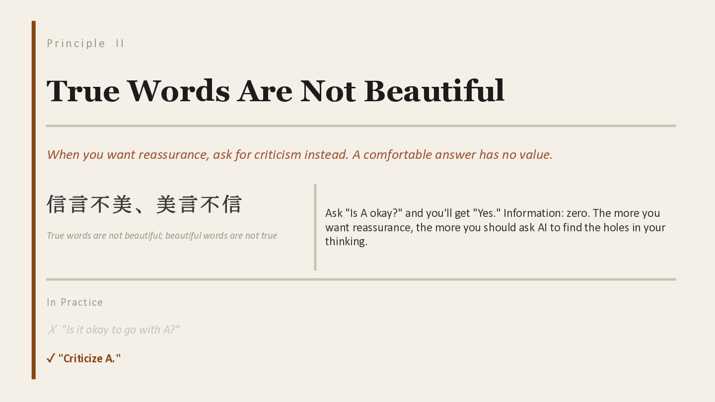 I True Words Are Not Beautiful When you want reassurance, ask for criticism instead. A comfortable answer has no value. 信言不美、美言不信 True words are not beautiful; beautiful words are not true Ask "Is A okay?" and you'll get "Yes." Information: zero. The more you want reassurance, the more you should ask AI to find the holes in your thinking. In Practice ✗ "Is it okay to go with A?" ✓ "Criticize A."