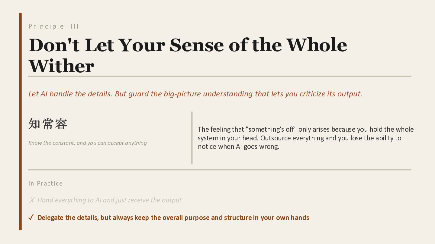 I I Don't Let Your Sense of the Whole Wither Let AI handle the details. But guard the big-picture understanding that lets you criticize its output. 知常容 Know the constant, and you can accept anything The feeling that "something's off" only arises because you hold the whole system in your head. Outsource everything and you lose the ability to notice when AI goes wrong. In Practice ✗ Hand everything to AI and just receive the output ✓ Delegate the details, but always keep the overall purpose and structure in your own hands