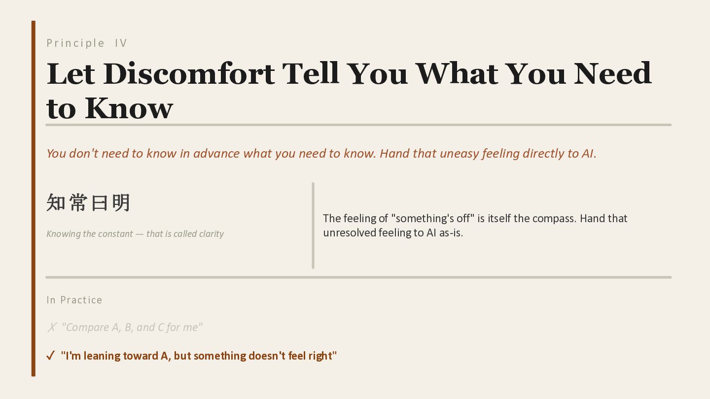 V Let Discomfort Tell You What You Need to Know You don't need to know in advance what you need to know. Hand that uneasy feeling directly to AI. 知常曰明 Knowing the constant — that is called clarity The feeling of "something's off" is itself the compass. Hand that unresolved feeling to AI as-is. In Practice ✗ "Compare A, B, and C for me" ✓ "I'm leaning toward A, but something doesn't feel right"