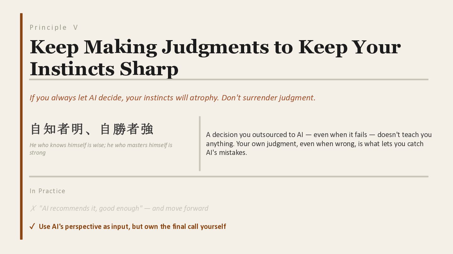 Keep Making Judgments to Keep Your Instincts Sharp If you always let AI decide, your instincts will atrophy. Don't surrender judgment. 自知者明、自勝者強 He who knows himself is wise; he who masters himself is strong A decision you outsourced to AI — even when it fails — doesn't teach you anything. Your own judgment, even when wrong, is what lets you catch AI's mistakes. In Practice ✗ "AI recommends it, good enough" — and move forward ✓ Use AI's perspective as input, but own the final call yourself