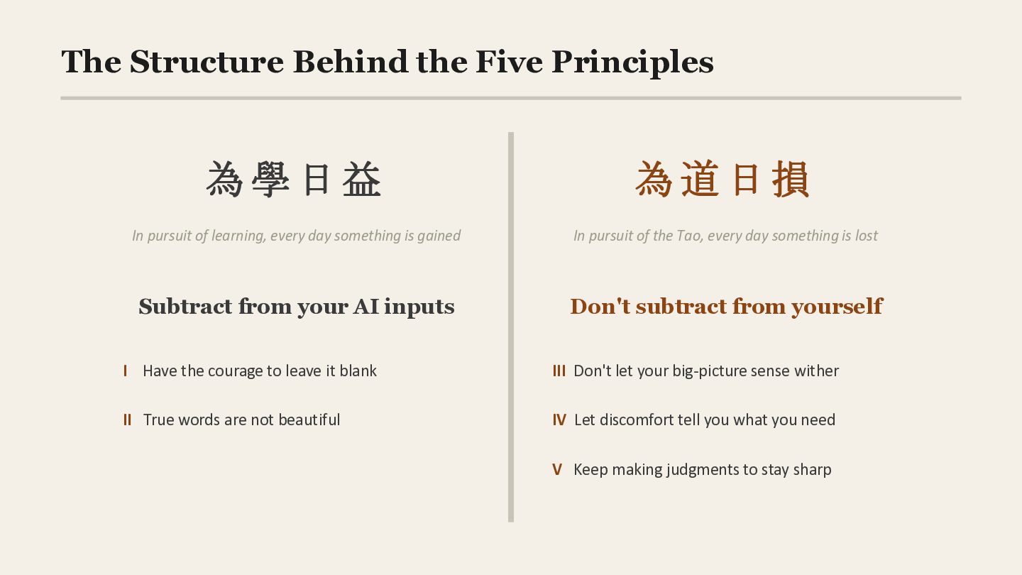 of learning, every day something is gained In pursuit of the Tao, every day something is lost Subtract from your AI inputs I Have the courage to leave it blank II True words are not beautiful Don't subtract from yourself III Don't let your big-picture sense wither IV Let discomfort tell you what you need V Keep making judgments to stay sharp
