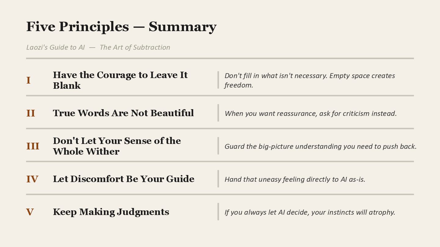 Art of Subtraction I Have the Courage to Leave It Blank Don't fill in what isn't necessary. Empty space creates freedom. II True Words Are Not Beautiful When you want reassurance, ask for criticism instead. III Don't Let Your Sense of the Whole Wither Guard the big-picture understanding you need to push back. IV Let Discomfort Be Your Guide Hand that uneasy feeling directly to AI as-is. V Keep Making Judgments If you always let AI decide, your instincts will atrophy.