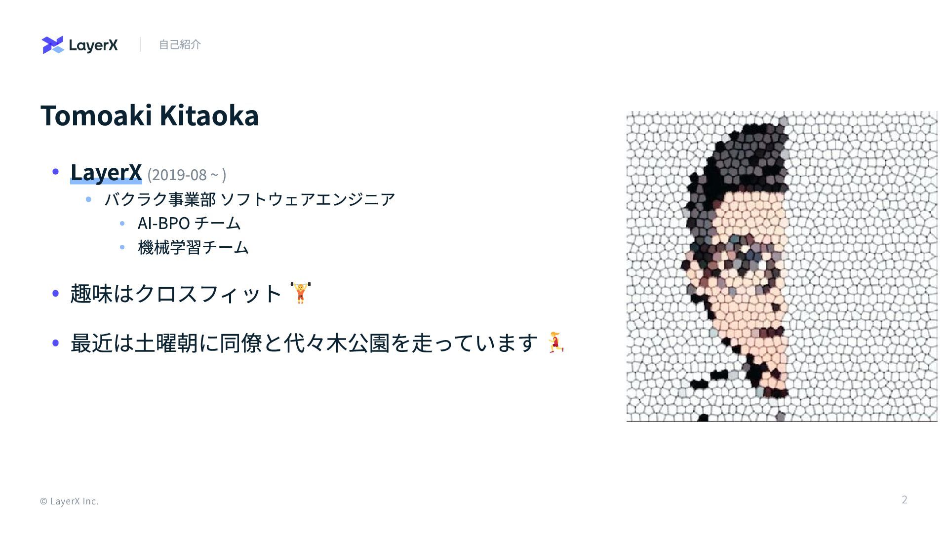 機械学習チーム 趣味はクロスフィット 最近は土曜朝に同僚と代々木公園を走っています © LayerX Inc. 2