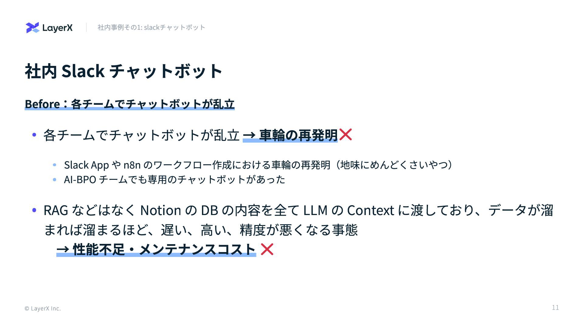 → 車輪の再発明 Slack App や n8n のワークフロー作成における車輪の再発明(地味にめんどくさいやつ) AI-BPO チームでも専用のチャットボットがあった RAG などはなく Notion の DB の内容を全て LLM の Context に渡しており、データが溜 まれば溜まるほど、遅い、高い、精度が悪くなる事態 → 性能不足・メンテナンスコスト 11