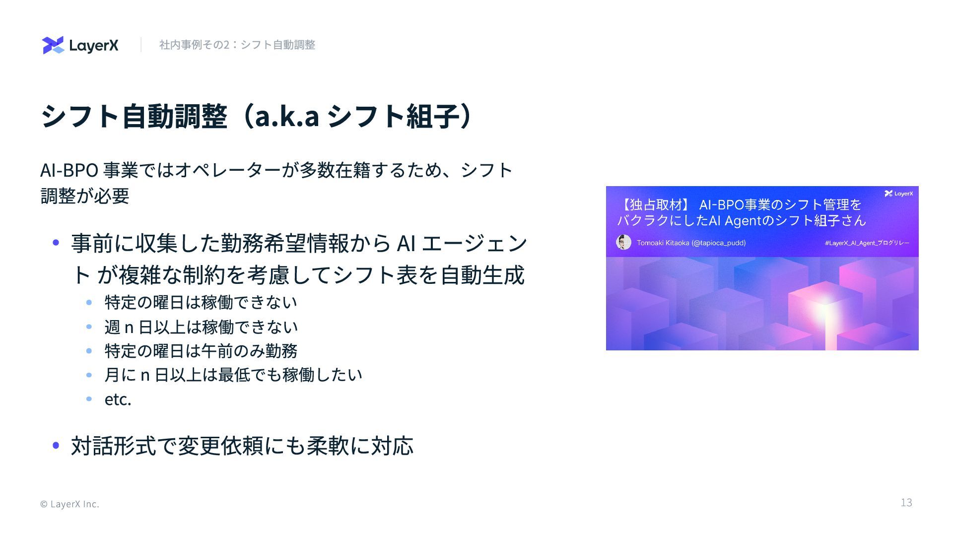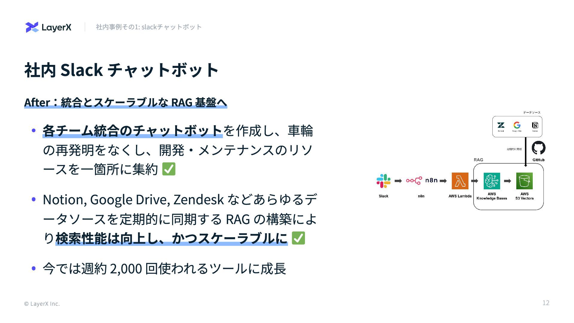 ースを一箇所に集約 Notion, Google Drive, Zendesk などあらゆるデ ータソースを定期的に同期する RAG の構築によ り検索性能は向上し、かつスケーラブルに 今では週約 2,000 回使われるツールに成長 © LayerX Inc. 12