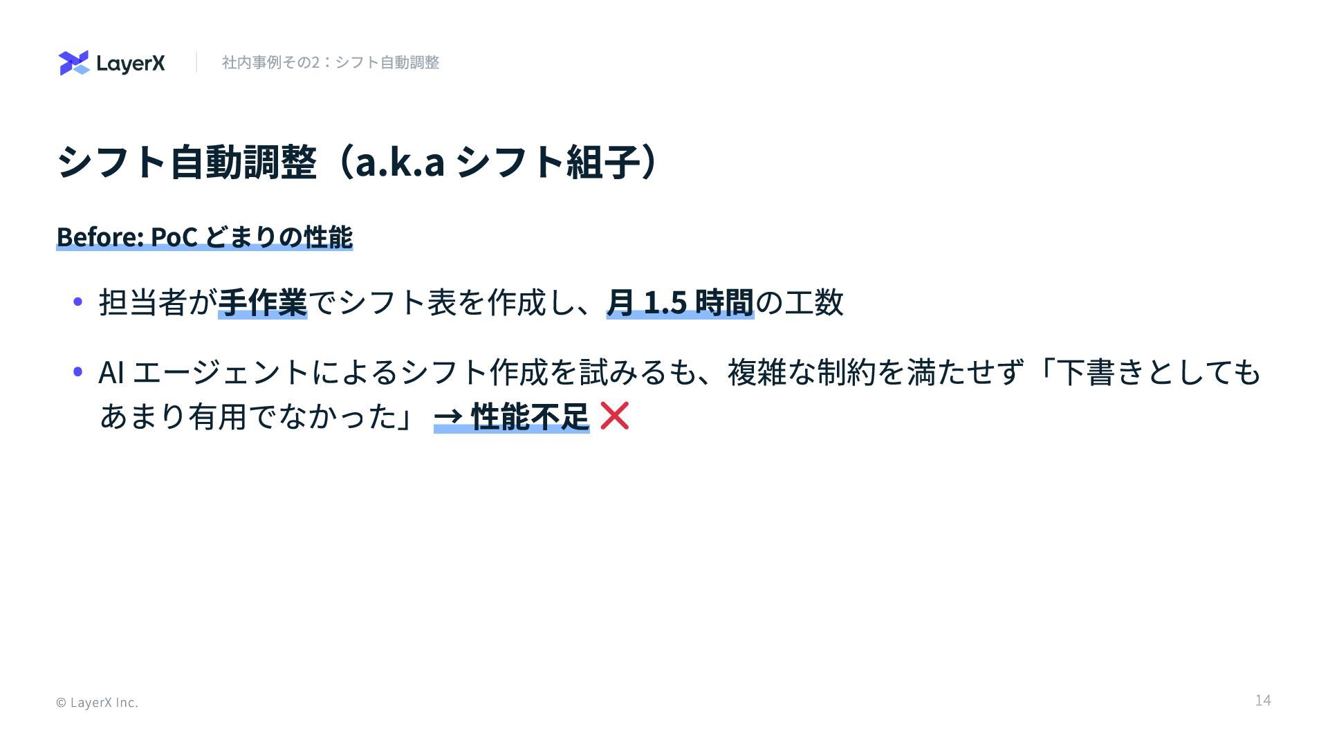 シフト自動調整(a.k.a シフト組子) Before: PoC どまりの性能 © LayerX Inc. 社内事例その2:シフト自動調整 担当者が手作業でシフト表を作成し、月