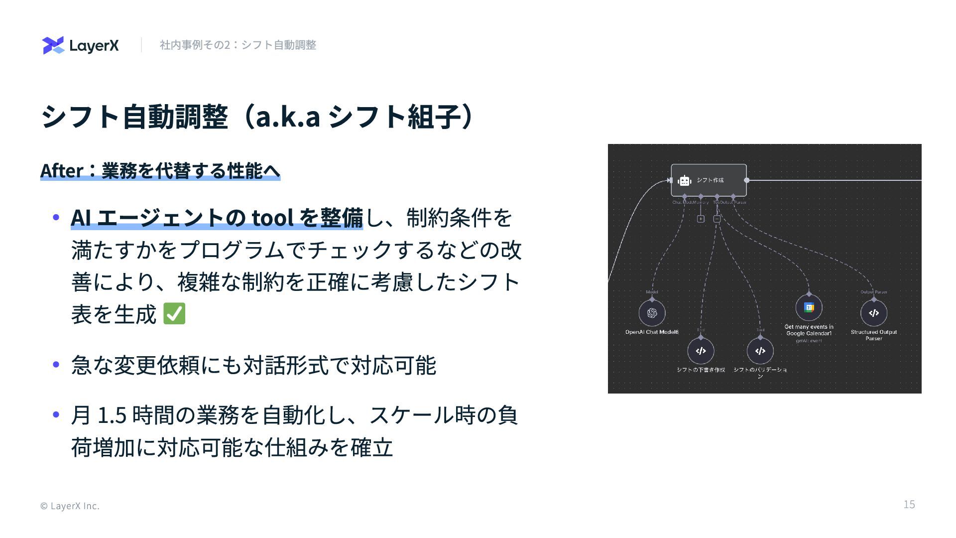表を生成 急な変更依頼にも対話形式で対応可能 月 1.5 時間の業務を自動化し、スケール時の負 荷増加に対応可能な仕組みを確立 © LayerX Inc. 15