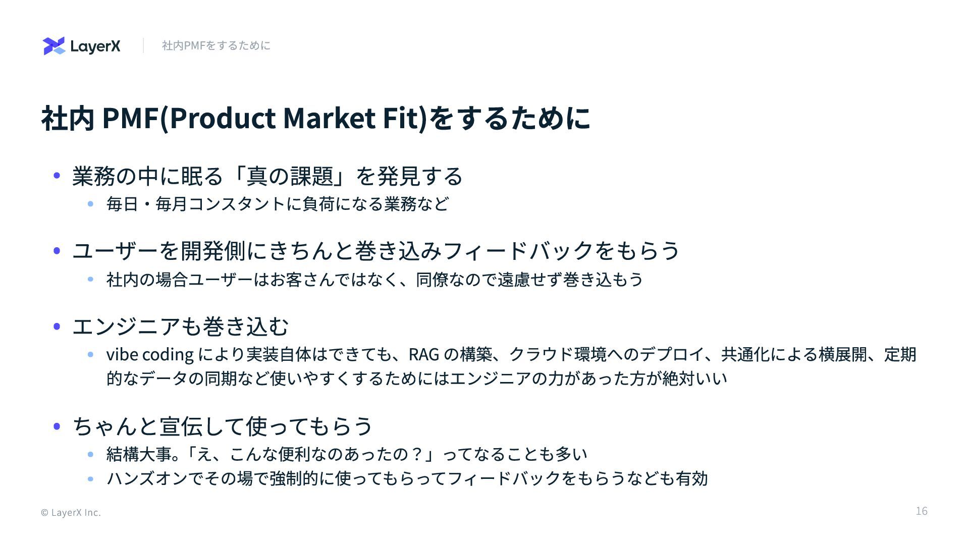 社内 PMF(Product Market Fit)をするために © LayerX Inc. 社内PMFをするために 業務の中に眠る「真の課題」を発見する 毎日・毎月コンスタントに負荷になる業務など