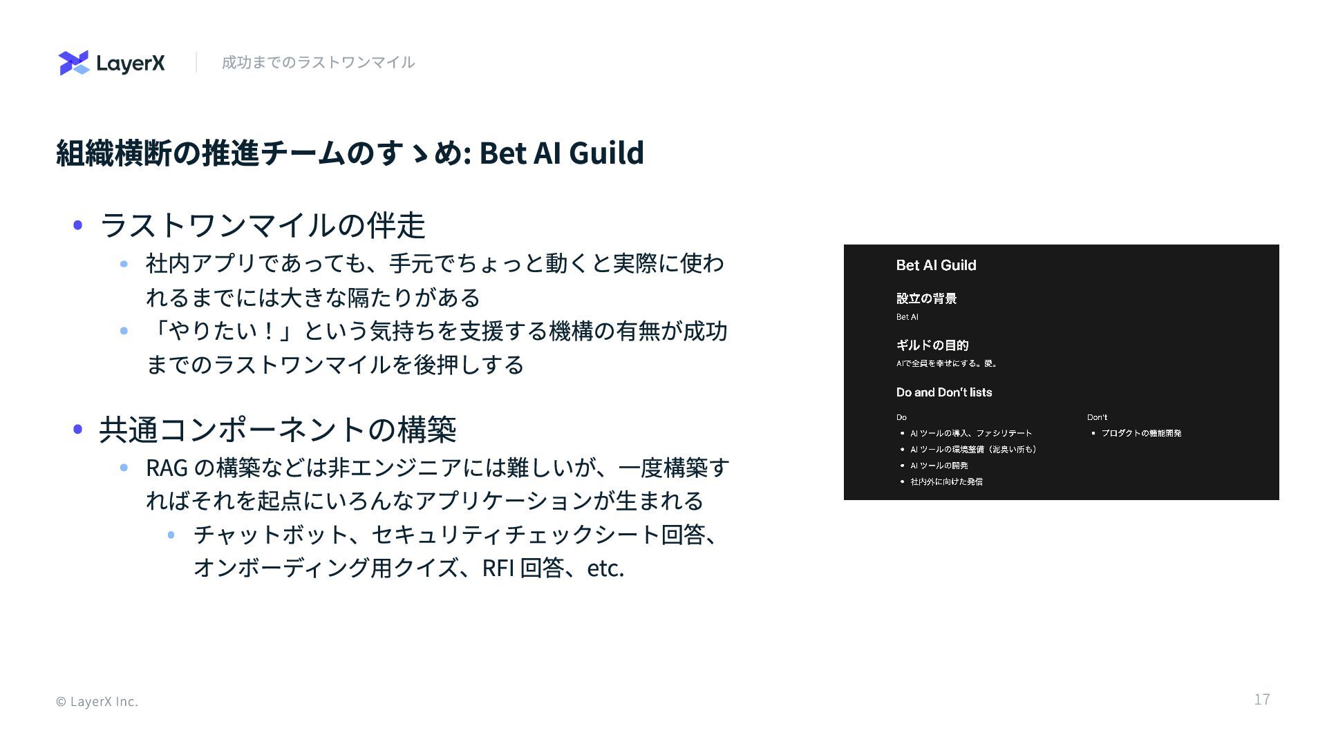 組織横断の推進チームのすゝめ: Bet AI Guild 成功までのラストワンマイル ラストワンマイルの伴走 社内アプリであっても、手元でちょっと動くと実際に使わ れるまでには大きな隔たりがある 「やりたい!」という気持ちを支援する機構の有無が成功 までのラストワンマイルを後押しする