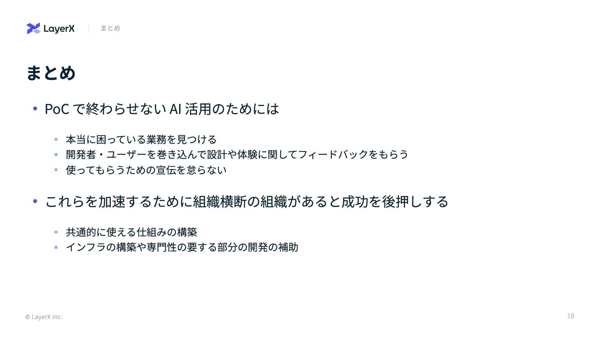 まとめ © LayerX Inc. まとめ PoC で終わらせない AI 活用のためには 本当に困っている業務を見つける