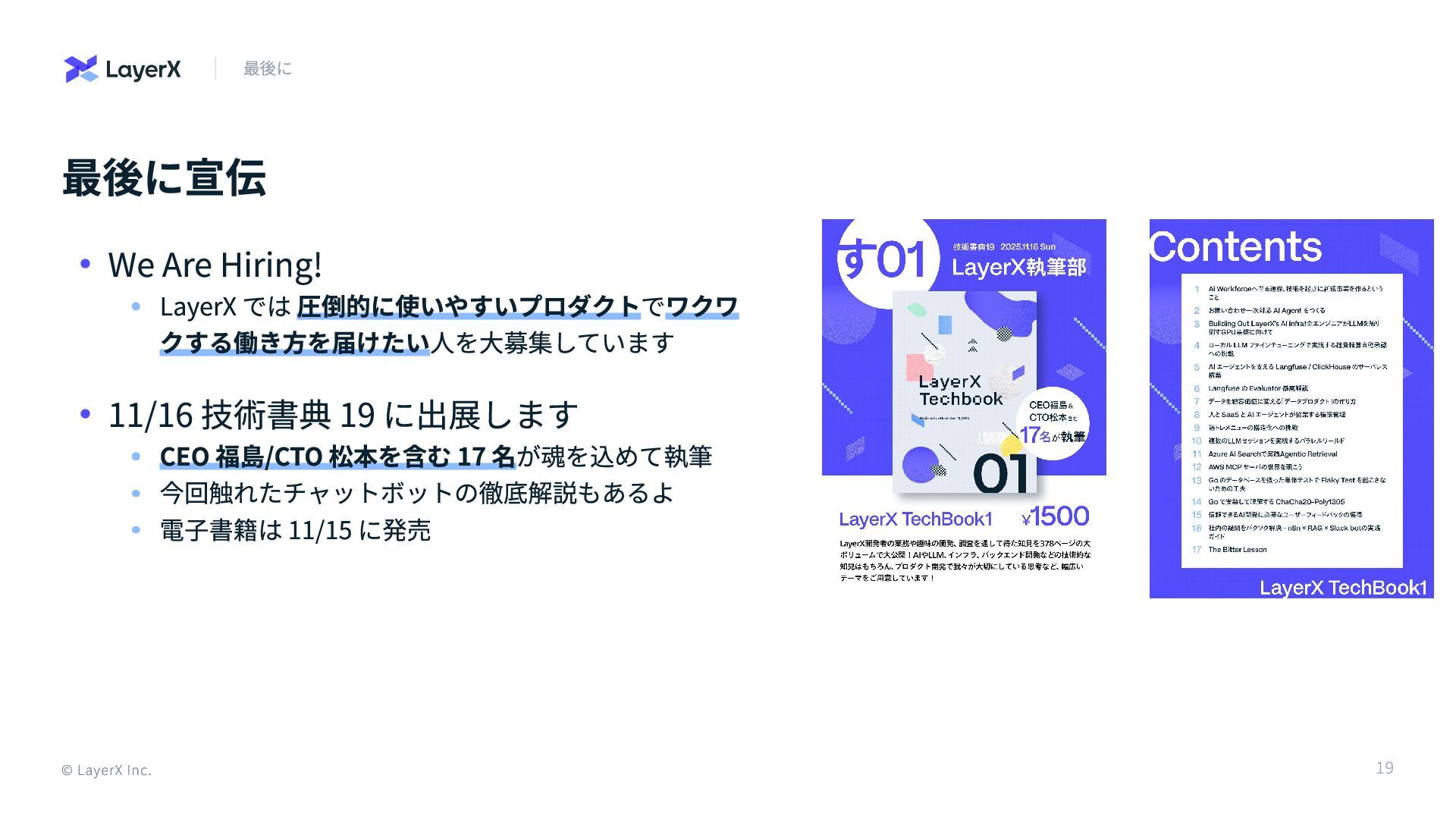 技術書典 19 に出展します CEO 福島/CTO 松本を含む 17 名が魂を込めて執筆 今回触れたチャットボットの徹底解説もあるよ 電子書籍は 11/15 に発売 © LayerX Inc. 19