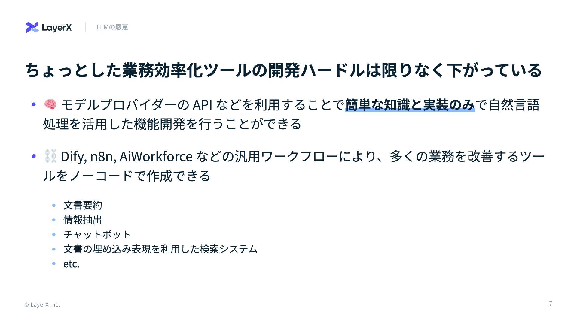 ちょっとした業務効率化ツールの開発ハードルは限りなく下がっている © LayerX Inc. LLMの恩恵 モデルプロバイダーの API などを利用することで簡単な知識と実装のみで自然言語 処理を活用した機能開発を行うことができる Dify,